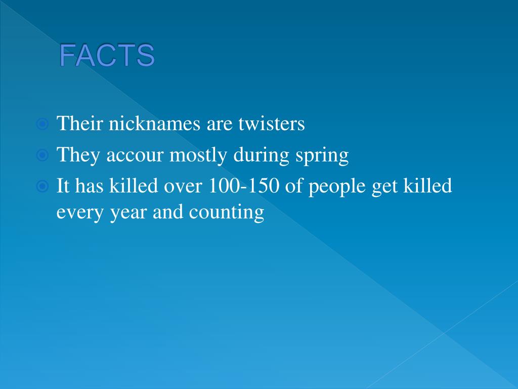 FACTS • Their nicknames are twisters • They accour mostly during spring • It has killed over 100-150 of people get killed every year and counting