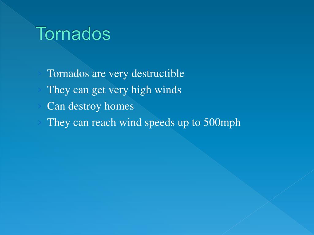 Tornados • Tornados are very destructible • They can get very high winds • Can destroy homes • They can reach wind speeds up to 500mph