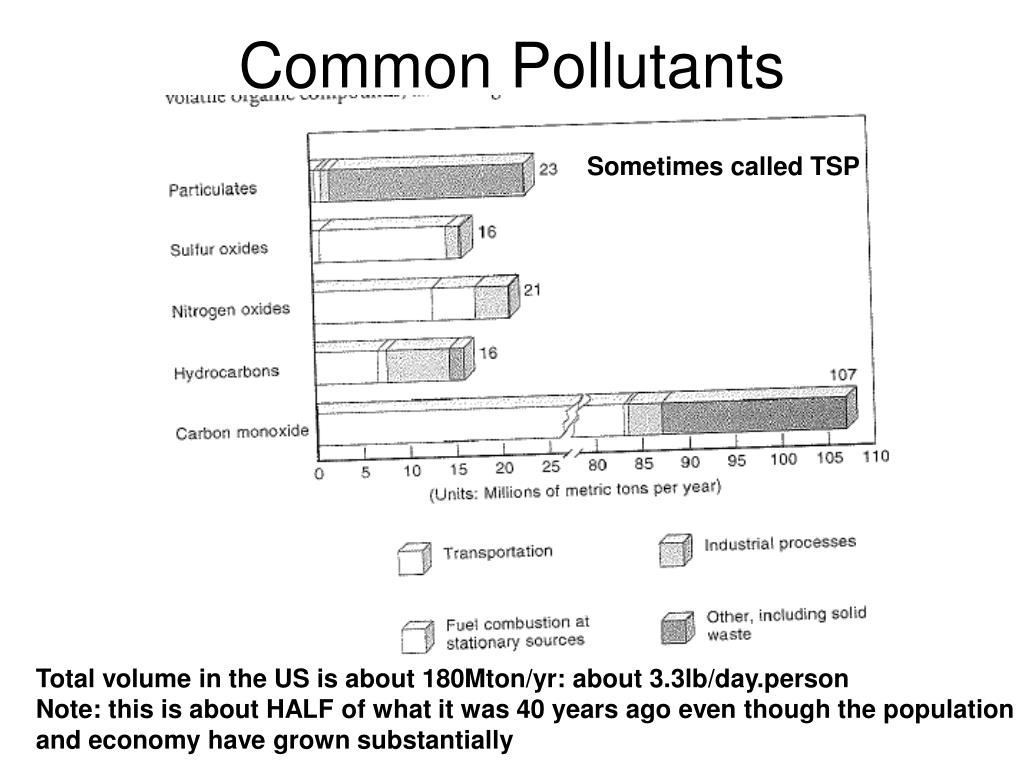 Common Pollutants Sometimes called TSP Total volume in the US is about 180Mton/yr: about 3.3lb/day.person Note: this is about HALF of what it was 40 years ago even though the population and economy have grown substantially