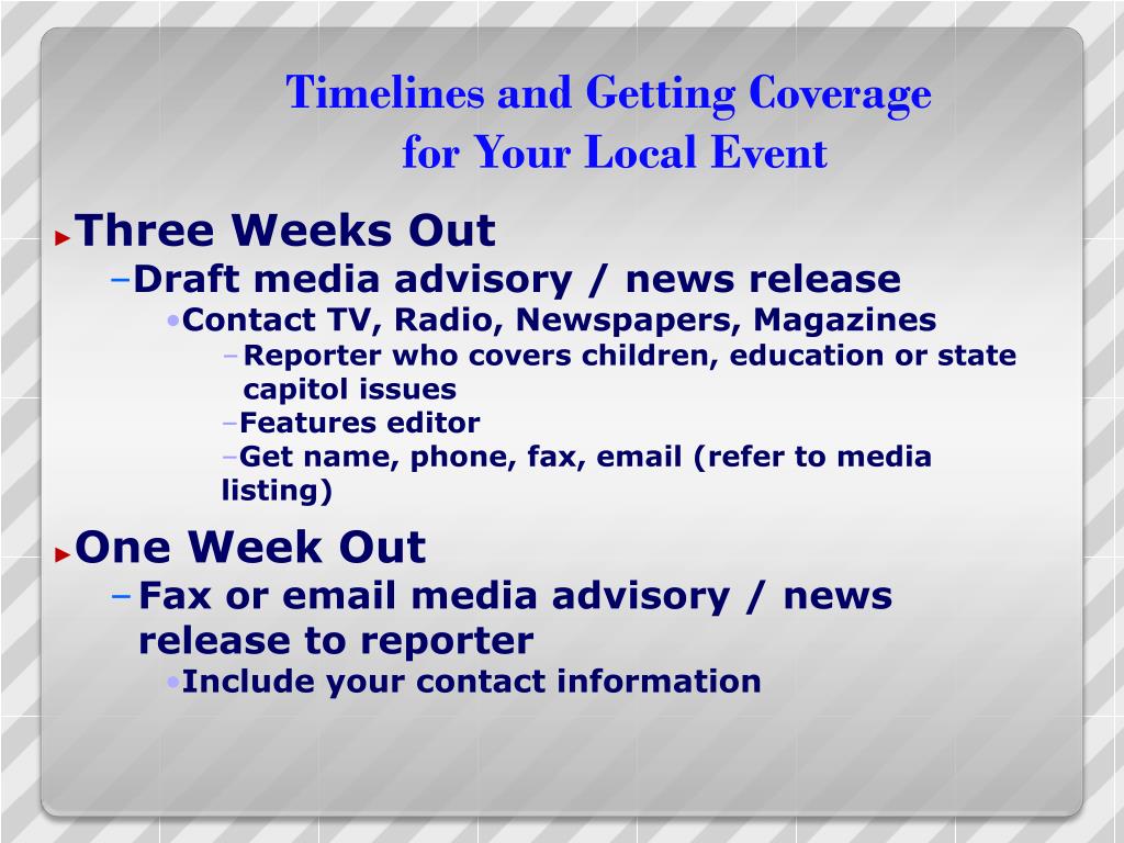Timelines and Getting Coverage for Your Local Event Three Weeks Out Draft media advisory / news release Contact TV, Radio, Newspapers, Magazines Reporter who covers children, education or state capitol issues Features editor Get name, phone, fax, email (refer to media listing) One Week Out Fax or email media advisory / news release to reporter Include your contact information