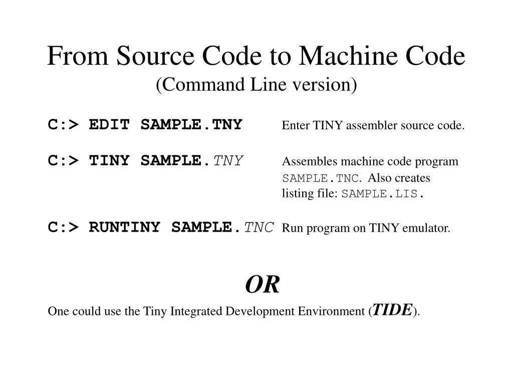 From Source Code to Machine Code (Command Line version) C:> EDIT SAMPLE.TNYEnter TINY assembler source code. C:> TINY SAMPLE.TNYAssembles machine code program SAMPLE.TNC. Also creates listing file: SAMPLE.LIS. C:> RUNTINY SAMPLE.TNCRun program on TINY emulator. OR One could use the Tiny Integrated Development Environment (TIDE).