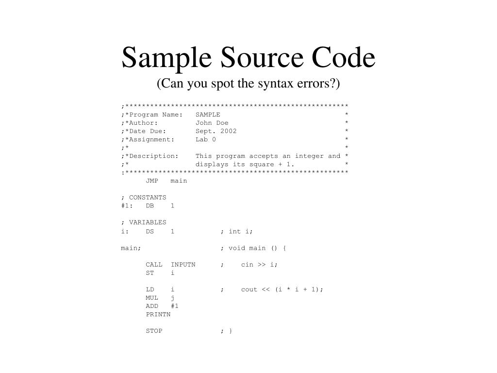 Sample Source Code(Can you spot the syntax errors?) ;****************************************************** ;*Program Name: SAMPLE * ;*Author: John Doe * ;*Date Due: Sept. 2002 * ;*Assignment: Lab 0 * ;* * ;*Description: This program accepts an integer and * ;* displays its square + 1. * :****************************************************** JMP main ; CONSTANTS #1: DB 1 ; VARIABLES i: DS 1 ; int i; main; ; void main () { CALL INPUTN ; cin >> i; ST i LD i ; cout << (i * i + 1); MUL j ADD #1 PRINTN STOP ; }