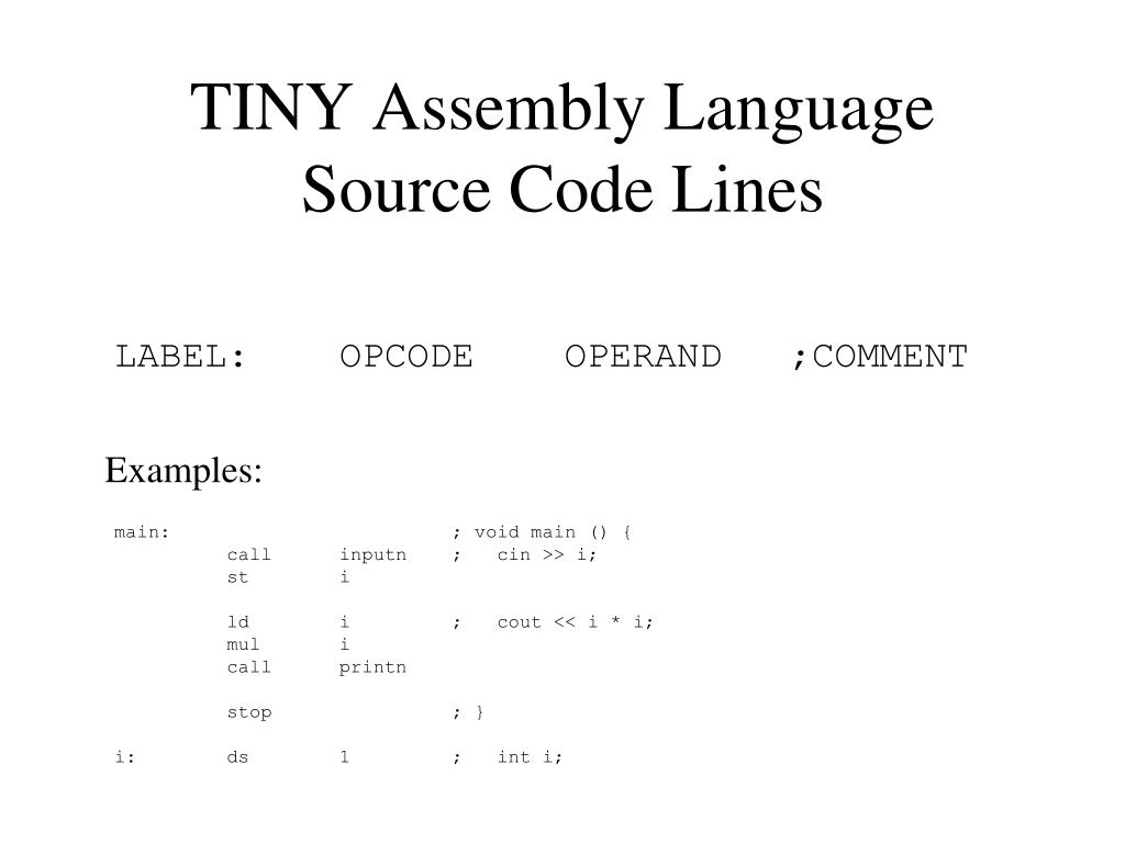 TINY Assembly Language Source Code Lines LABEL: OPCODE OPERAND ;COMMENT Examples: main: ; void main () { call inputn ; cin >> i; st i ld i ; cout << i * i; mul i call printn stop ; } i: ds 1 ; int i;