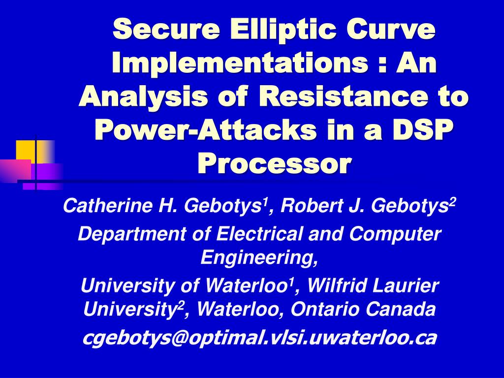 Secure Elliptic Curve Implementations : An Analysis of Resistance to Power-Attacks in a DSP Processor. Catherine H. Gebotys 1 , Robert J. Gebotys 2 Department of Electrical and Computer Engineering, University of Waterloo 1 , Wilfrid Laurier University 2 , Waterloo, Ontario Canada