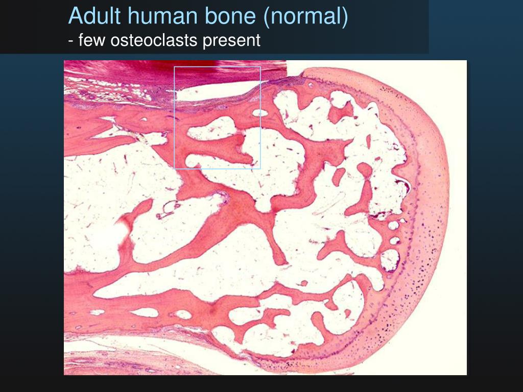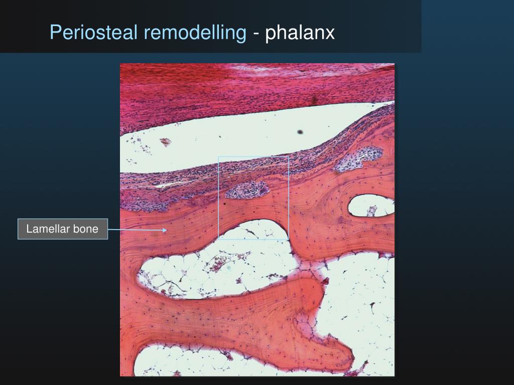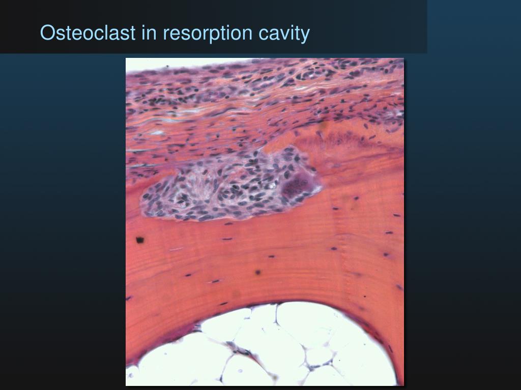 Adult human bone (phalanx). Adult human bone (normal) - few osteoclasts present. Lamellar bone . Periosteal remodelling - phalanx. Osteoclast in resorption cavity.