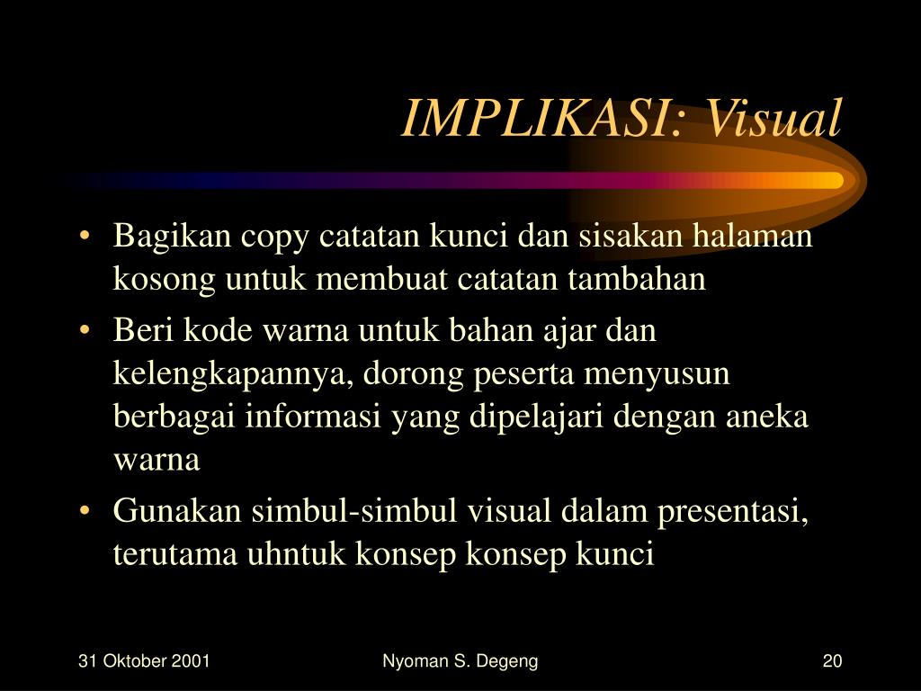 IMPLIKASI: Visual • Bagikan copy catatan kunci dan sisakan halaman kosong untuk membuat catatan tambahan • Beri kode warna untuk bahan ajar dan kelengkapannya, dorong peserta menyusun berbagai informasi yang dipelajari dengan aneka warna • Gunakan simbul-simbul visual dalam presentasi, terutama uhntuk konsep konsep kunci Nyoman S. Degeng