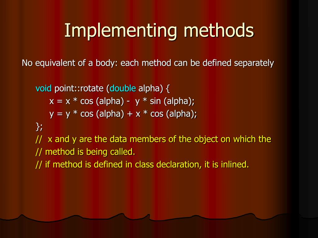 Implementing methods No equivalent of a body: each method can be defined separately void point::rotate (double alpha) { x = x * cos (alpha) - y * sin (alpha); y = y * cos (alpha) + x * cos (alpha); }; // x and y are the data members of the object on which the // method is being called. // if method is defined in class declaration, it is inlined.