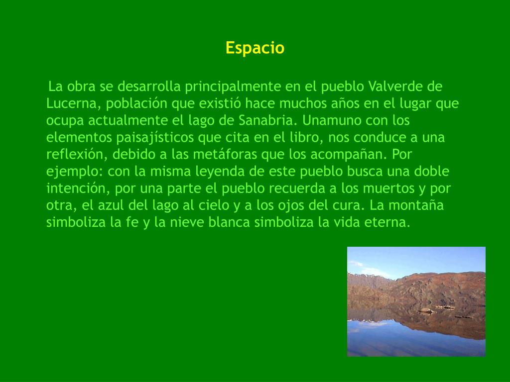 Espacio La obra se desarrolla principalmente en el pueblo Valverde de Lucerna, población que existió hace muchos años en el lugar que ocupa actualmente el lago de Sanabria. Unamuno con los elementos paisajísticos que cita en el libro, nos conduce a una reflexión, debido a las metáforas que los acompañan. Por ejemplo: con la misma leyenda de este pueblo busca una doble intención, por una parte el pueblo recuerda a los muertos y por otra, el azul del lago al cielo y a los ojos del cura. La montaña simboliza la fe y la nieve blanca simboliza la vida eterna.