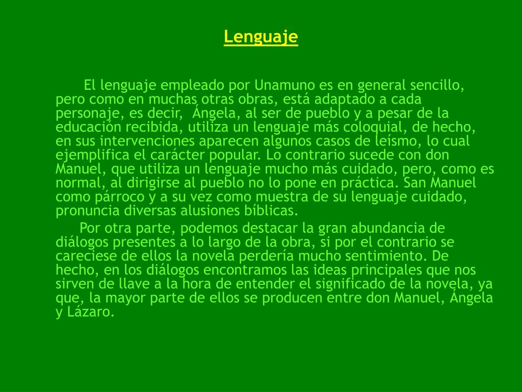 Lenguaje El lenguaje empleado por Unamuno es en general sencillo, pero como en muchas otras obras, está adaptado a cada personaje, es decir, Ángela, al ser de pueblo y a pesar de la educación recibida, utiliza un lenguaje más coloquial, de hecho, en sus intervenciones aparecen algunos casos de leísmo, lo cual ejemplifica el carácter popular. Lo contrario sucede con don Manuel, que utiliza un lenguaje mucho más cuidado, pero, como es normal, al dirigirse al pueblo no lo pone en práctica. San Manuel como párroco y a su vez como muestra de su lenguaje cuidado, pronuncia diversas alusiones bíblicas. Por otra parte, podemos destacar la gran abundancia de diálogos presentes a lo largo de la obra, si por el contrario se careciese de ellos la novela perdería mucho sentimiento. De hecho, en los diálogos encontramos las ideas principales que nos sirven de llave a la hora de entender el significado de la novela, ya que, la mayor parte de ellos se producen entre don Manuel, Ángela y Lázaro.