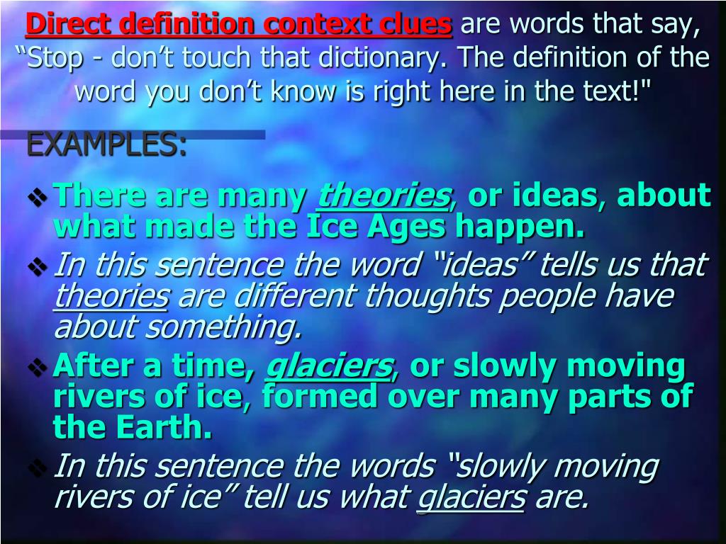 Direct definition context cluesare words that say, “Stop - don’t touch that dictionary. The definition of the word you don’t know is right here in the text!" EXAMPLES: • There are many theories, orideas, about what made the Ice Ages happen. • In this sentence the word “ideas” tells us that theories are different thoughts people have about something. • After a time, glaciers, or slowly moving rivers of ice, formed over many parts of the Earth. • In this sentence the words “slowly moving rivers of ice” tell us what glaciers are.