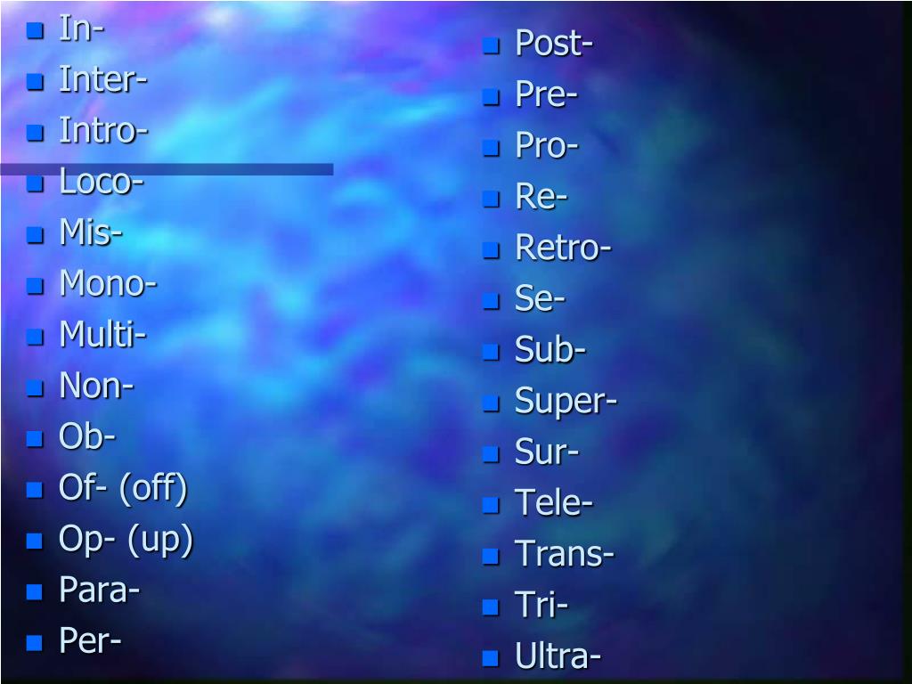 In- • Inter- • Intro- • Loco- • Mis- • Mono- • Multi- • Non- • Ob- • Of- (off) • Op- (up) • Para- • Per- • Post- • Pre- • Pro- • Re- • Retro- • Se- • Sub- • Super- • Sur- • Tele- • Trans- • Tri- • Ultra-