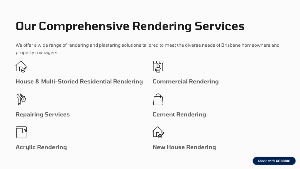 Our Comprehensive Rendering Services We offer a wide range of rendering and plastering solutions tailored to meet the diverse needs of Brisbane homeowners and property managers. House & Multi-Storied Residential Rendering Commercial Rendering Repairing Services Cement Rendering Acrylic Rendering New House Rendering