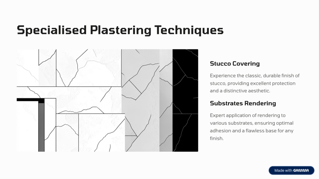 Specialised Plastering Techniques Stucco Covering Experience the classic, durable finish of stucco, providing excellent protection and a distinctive aesthetic. Substrates Rendering Expert application of rendering to various substrates, ensuring optimal adhesion and a flawless base for any finish.