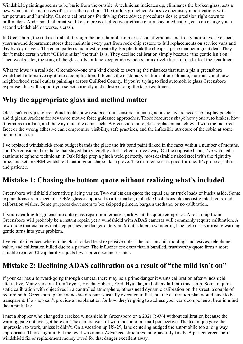 Mistake 3: Assuming mobile provider is invariably interchangeable with in- shop Mobile auto glass Greensboro technicians can do nice work. The best possible ones convey warmness lamps, moisture meters, and calibrated equipment to set glass correctly in driveways and parking garages. But situations subject. On damp days, with temps within the 40s, some urethanes take lots longer to medication. In blazing July warm, the operating time shrinks immediate, which may end in rushed sets or poor bead profiles. And no longer each and every activity fits the street, specifically whilst static calibration aims are obligatory or when rust fix on the pinch weld is required. When you name for greensboro cell windshield restoration, ask approximately cure occasions given the day’s climate, the adhesive manufacturer and lot, and regardless of whether they have got a plan if humidity spikes. A smart tech will tell you whilst mobile works and whilst an in-store set is more secure. A flat, clear, wind-secure workspace can also be the change between a life-time seal and a leak six months later. Mistake four: Overlooking rust and pinch weld preparation Under the trim and ancient urethane, you many times to find bare steel or rust. I’ve peeled to come back a molding on a Civic and uncovered a rust ridge along the precise aspect in which a previous installer nicked paint. Water crept less than the bead and did the relax. Skipping genuine prep creates a loop: rust raises the bead, the bead loses adhesion, and the following windshield leaks or lifts. If you’re scheduling greensboro automobile glass alternative, ask how the shop handles rust. The precise resolution consists of taking out historical urethane to a protected thickness, treating rust to bare steel, priming with the fitting product, and respecting flash instances. That system occurs whether or not the glass is OEM or aftermarket. It’s not glamorous, it’s important. Mistake five: Treating aftermarket and OEM as equal without nuance There are right aftermarket windshields, and there are mediocre ones. OEM glass is absolutely not highest both, nevertheless it tends to suit sensor and bracket geometry, acoustic layers, and tint more at all times. On trucks wherein camera calibration is finicky, or with heads-up reveal, I lean OEM or at least OE-targeted suppliers. For older autos or those with out driving force suggestions, a first-class aftermarket is additionally an honest value. Greensboro windshield substitute prices will characteristically use “OE identical” language. Ask for the brand and element variety. If the store is sure, they're going to inform you if the glass is Saint-Gobain, Pilkington, AGC, FYG, or an additional authentic manufacturer. For heads-up exhibit windshields, determine the genuine reflective layer. For acoustic windshields, make certain the sound-dampening interlayer. These small print substitute how the car sounds and the way the tech fits. Mistake 6: Ignoring treatment times and risk-free power-away windows Urethane adhesives have particular safe force-away times that depend on temperature, humidity, bead length, and car or truck layout. Many installers use primers and expanded-medication merchandise, yet now not all adhesives are same. In Greensboro’s humidity, the moisture-cure chemistry ordinarilly supports, however on cold mornings a windshield would desire greater time than a shop desires to admit. A reputable greensboro windshield restore or replacement issuer will explain when you'll appropriately drive, whilst you would wash the car, and in case you deserve to avert slamming doorways or high-velocity highways. I’ve seen valued clientele depart in 20 minutes in view that “I’m past due,” then go back with wind noise and a free true aspect. If you'll be able to, supply the adhesive the time it wants. Safe power-away is not very a proposal. Mistake 7: Assuming any store can address recalibration or that the supplier is forever the in basic terms option Dealers deal with many calibrations well, yet autonomous outlets in Greensboro now make investments heavily in ADAS machine. The exceptional independents use OEM approaches and 1/3-social gathering ambitions, doc pre- and submit- scans, and street look at various dynamic calibrations on acceptable routes. On any other hand, a few preferred fix malls dabble with out the preparation or the controlled surroundings, which is risky.