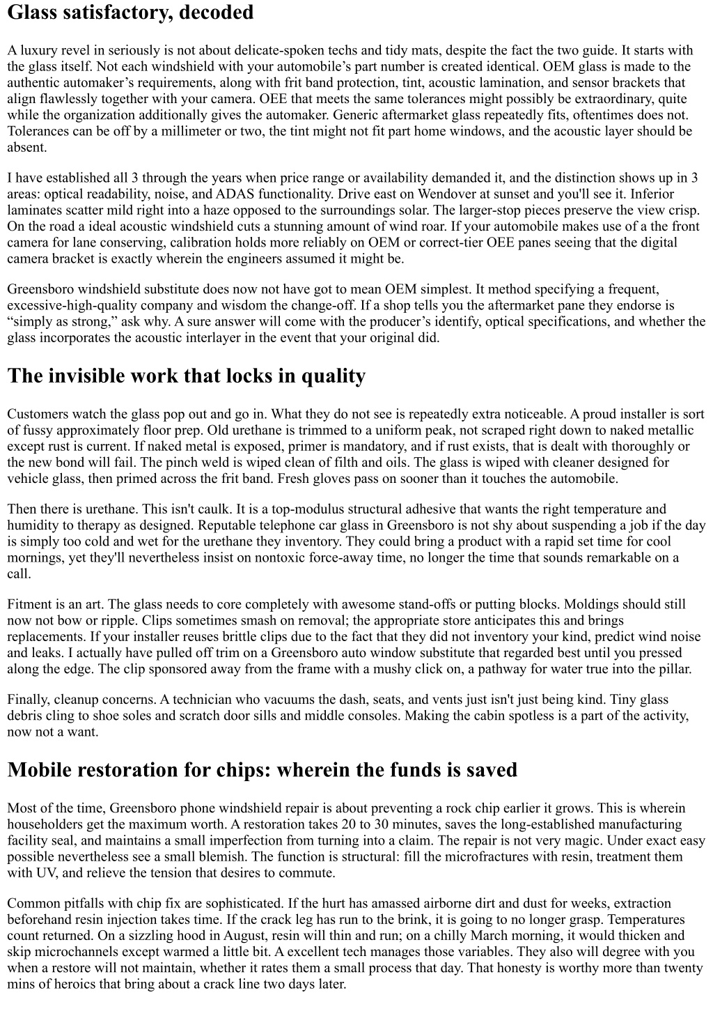 Request new moldings and clips the place desirable; stay clear of reusing brittle hardware. Get the workmanship guarantee in writing, overlaying leaks, wind noise, and pressure cracks. Keep that listing in your mobile. It turns a five‑minute call right into a certain booking. Greensboro key terms, clearly lived People look for terms like vehicle glass Greensboro simply because they prefer any one local who displays up on time and does it desirable the 1st time. That intuition is sound. Whether you are after Greensboro windshield fix for a refreshing chip from a pressure up Battleground, a full Greensboro windshield replacement after a crack ran throughout your view on I‑40, or a discreet Greensboro vehicle window replacement after a damage‑in downtown, treat the decision with the load it merits. Good cell auto glass in Greensboro blends comfort and craftsmanship. It is a technician who knows when rock chip fix in Greensboro can retailer your authentic glass and while the damage is prior saving. It is a corporation that stands behind Greensboro auto glass replacement with materials they may be proud to call and strategies they may be completely happy to provide an explanation for. Final notes from the field I have replaced glass in immaculate garages and in gravel driveways beneath a Carolina sky. The most fulfilling jobs percentage a rhythm. We gradual down on the proper moments. We payment alignments twice. We wipe edges until the cloth remains smooth. We decline paintings whilst climate might compromise the bond. We calibrate cameras after which scan on actual roads, no longer just a scan device display. We provide you with the quiet windshield you forgot existed. Avoid the in style pitfalls by using choosing talent over speed, specification over generalities, and care over comfort whilst both warfare. Greensboro mobilephone windshield restore can really feel common, but the craft at the back of that is whatever thing however casual. Pick a spouse who treats your glass with the respect it deserves, and the line ahead will glance because it could: clean, stable, and quiet.