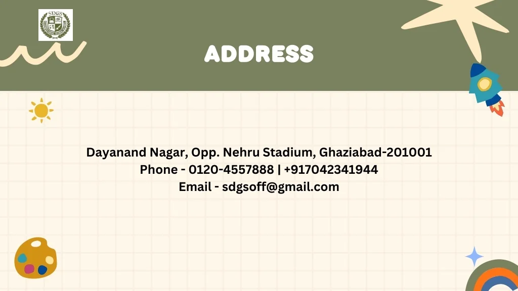 ADDRESS Dayanand Nagar, Opp. Nehru Stadium, Ghaziabad-201001 Phone - 0120-4557888 | +917042341944 Email - sdgsoff@gmail.com