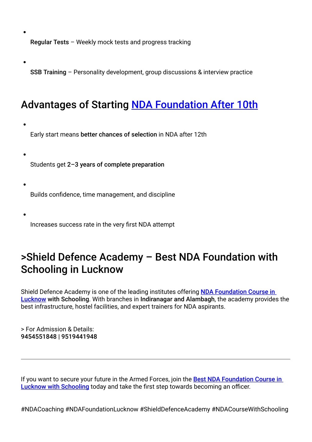 Regular Tests – Weekly mock tests and progress tracking SSB Training – Personality development, group discussions & interview practice Advantages of Starting NDA Foundation After 10th Early start means better chances of selection in NDA after 12th Students get 2–3 years of complete preparation Builds confidence, time management, and discipline Increases success rate in the very first NDA attempt >Shield Defence Academy – Best NDA Foundation with Schooling in Lucknow Shield Defence Academy is one of the leading institutes offering NDA Foundation Course in Lucknow with Schooling. With branches in Indiranagar and Alambagh, the academy provides the best infrastructure, hostel facilities, and expert trainers for NDA aspirants. > For Admission & Details: 9454551848 | 9519441948 If you want to secure your future in the Armed Forces, join the Best NDA Foundation Course in Lucknow with Schooling today and take the first step towards becoming an officer. #NDACoaching #NDAFoundationLucknow #ShieldDefenceAcademy #NDACourseWithSchooling