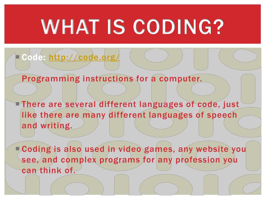 What is Coding? • Code: http://code.org/Programming instructions for a computer. • There are several different languages of code, just like there are many different languages of speech and writing. • Coding is also used in video games, any website you see, and complex programs for any profession you can think of.