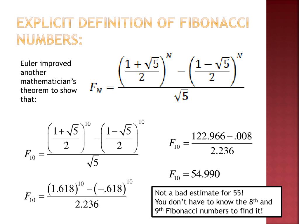 Explicit Definition of Fibonacci Numbers: Euler improved another mathematician’s theorem to show that: Not a bad estimate for 55! You don’t have to know the 8th and 9th Fibonacci numbers to find it!