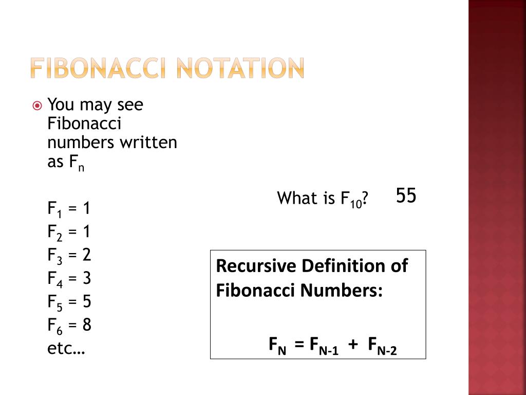 Fibonacci notation • You may see Fibonacci numbers written as Fn F1 = 1 F2 = 1 F3 = 2 F4 = 3 F5 = 5 F6 = 8 etc… 55 What is F10? Recursive Definition of Fibonacci Numbers: FN = FN-1 + FN-2