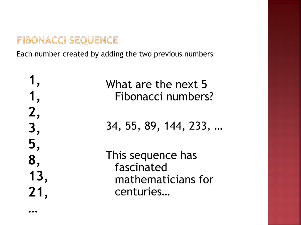 Fibonacci sequence Each number created by adding the two previous numbers What are the next 5 Fibonacci numbers? 34, 55, 89, 144, 233, … This sequence has fascinated mathematicians for centuries… 1, 1, 2, 3, 5, 8, 13, 21, …