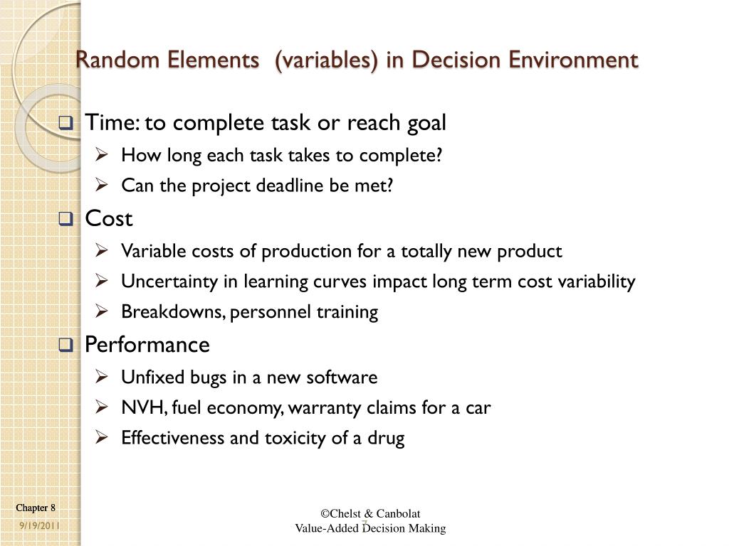 Random Elements (variables) in Decision Environment • Time: to complete task or reach goal • How long each task takes to complete? • Can the project deadline be met? • Cost • Variable costs of production for a totally new product • Uncertainty in learning curves impact long term cost variability • Breakdowns, personnel training • Performance • Unfixed bugs in a new software • NVH, fuel economy, warranty claims for a car • Effectiveness and toxicity of a drug