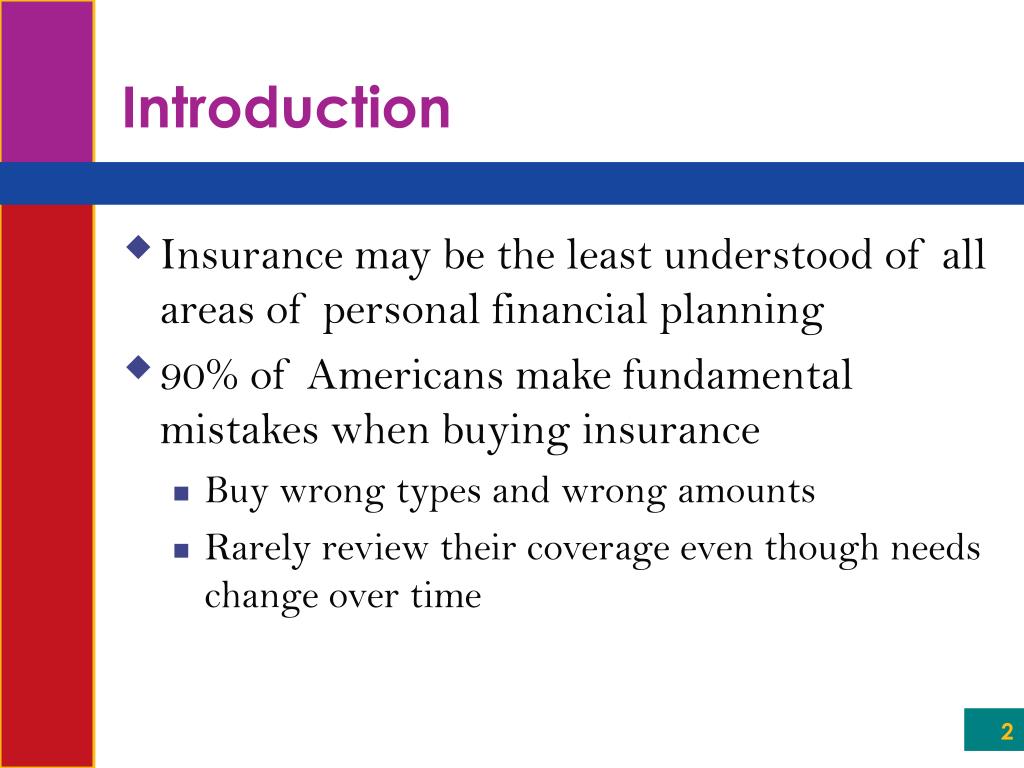 Introduction • Insurance may be the least understood of all areas of personal financial planning • 90% of Americans make fundamental mistakes when buying insurance • Buy wrong types and wrong amounts • Rarely review their coverage even though needs change over time