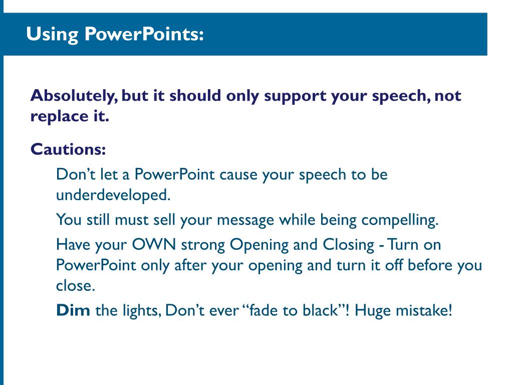 Using PowerPoints: Absolutely, but it should only support your speech, not replace it. Cautions: Don’t let a PowerPoint cause your speech to be underdeveloped. You still must sell your message while being compelling. Have your OWN strong Opening and Closing - Turn on PowerPoint only after your opening and turn it off before you close. Dim the lights, Don’t ever “fade to black”! Huge mistake!