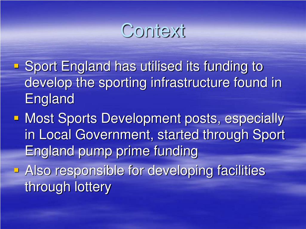 Context • Sport England has utilised its funding to develop the sporting infrastructure found in England • Most Sports Development posts, especially in Local Government, started through Sport England pump prime funding • Also responsible for developing facilities through lottery