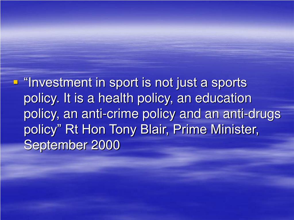 “Investment in sport is not just a sports policy. It is a health policy, an education policy, an anti-crime policy and an anti-drugs policy” Rt Hon Tony Blair, Prime Minister, September 2000
