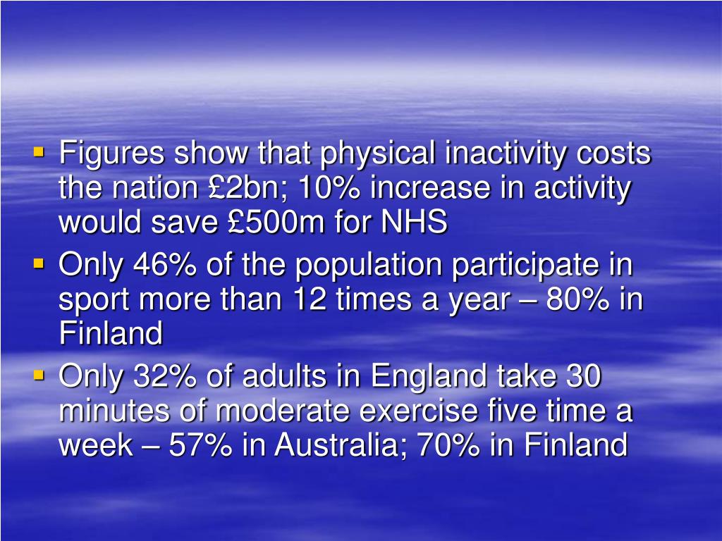 Figures show that physical inactivity costs the nation £2bn; 10% increase in activity would save £500m for NHS • Only 46% of the population participate in sport more than 12 times a year – 80% in Finland • Only 32% of adults in England take 30 minutes of moderate exercise five time a week – 57% in Australia; 70% in Finland
