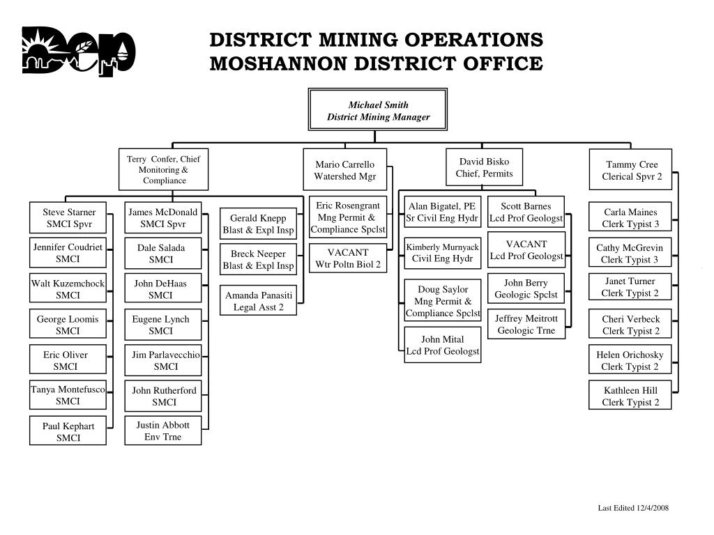 DISTRICT MINING OPERATIONS MOSHANNON DISTRICT OFFICE Michael Smith District Mining Manager Terry Confer, ChiefMonitoring & Compliance David Bisko Chief, Permits Mario Carrello Watershed Mgr Tammy Cree Clerical Spvr 2 Eric RosengrantMng Permit & Compliance Spclst Alan Bigatel, PE Sr Civil Eng Hydr Scott Barnes Lcd Prof Geologst Steve Starner SMCI Spvr James McDonald SMCI Spvr Carla Maines Clerk Typist 3 Gerald Knepp Blast & Expl Insp VACANT Lcd Prof Geologst Jennifer CoudrietSMCI Dale Salada SMCI Kimberly Murnyack Civil Eng Hydr Cathy McGrevin Clerk Typist 3 Breck Neeper Blast & Expl Insp VACANTWtr Poltn Biol 2 Walt Kuzemchock SMCI John DeHaas SMCI John Berry Geologic Spclst Janet TurnerClerk Typist 2 Doug Saylor Mng Permit & Compliance Spclst Amanda PanasitiLegal Asst 2 George Loomis SMCI Eugene Lynch SMCI Jeffrey Meitrott Geologic Trne Cheri Verbeck Clerk Typist 2 John MitalLcd Prof Geologst Eric Oliver SMCI Jim Parlavecchio SMCI Helen Orichosky Clerk Typist 2 Tanya MontefuscoSMCI John Rutherford SMCI Kathleen Hill Clerk Typist 2 Paul Kephart SMCI Justin AbbottEnv Trne Last Edited 12/4/2008