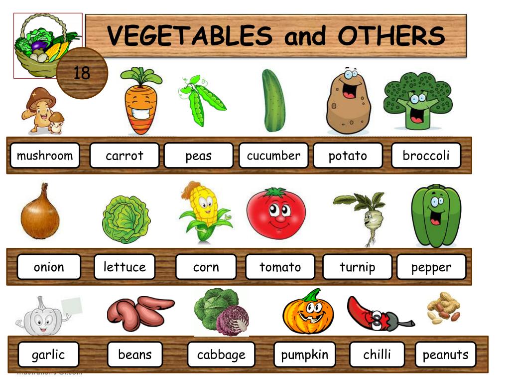 VEGETABLES and OTHERS 18 1 2 3 4 5 6 mushroom carrot peas cucumber potato broccoli 7 8 9 10 11 12 onion lettuce corn tomato turnip pepper 13 14 15 16 17 18 garlic beans cabbage pumpkin chilli peanuts