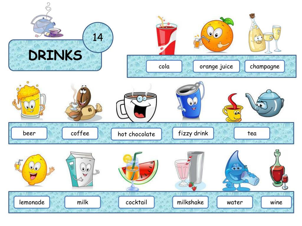 14 DRINKS 1 2 3 cola orange juice champagne 4 5 6 7 8 beer coffee fizzy drink tea hot chocolate 9 10 11 12 13 14 lemonade milk cocktail milkshake water wine