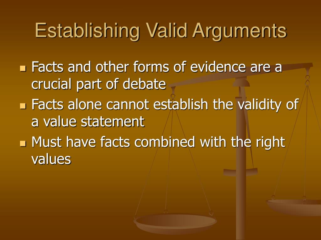 Establishing Valid Arguments • Facts and other forms of evidence are a crucial part of debate • Facts alone cannot establish the validity of a value statement • Must have facts combined with the right values