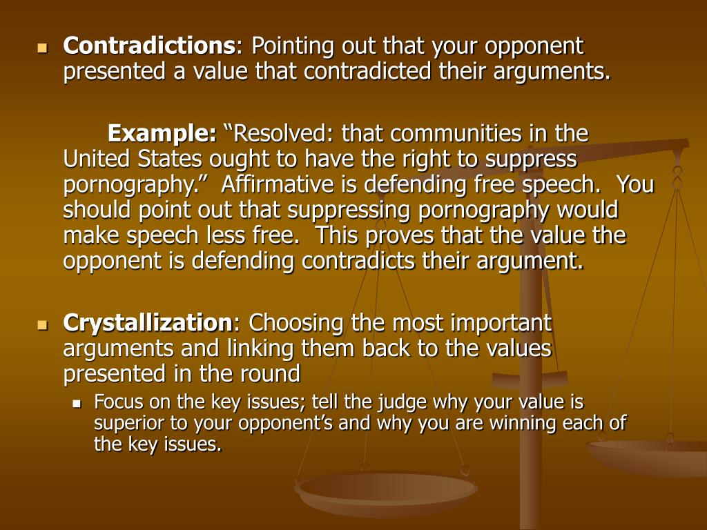 Contradictions: Pointing out that your opponent presented a value that contradicted their arguments. Example: “Resolved: that communities in the United States ought to have the right to suppress pornography.” Affirmative is defending free speech. You should point out that suppressing pornography would make speech less free. This proves that the value the opponent is defending contradicts their argument. • Crystallization: Choosing the most important arguments and linking them back to the values presented in the round • Focus on the key issues; tell the judge why your value is superior to your opponent’s and why you are winning each of the key issues.