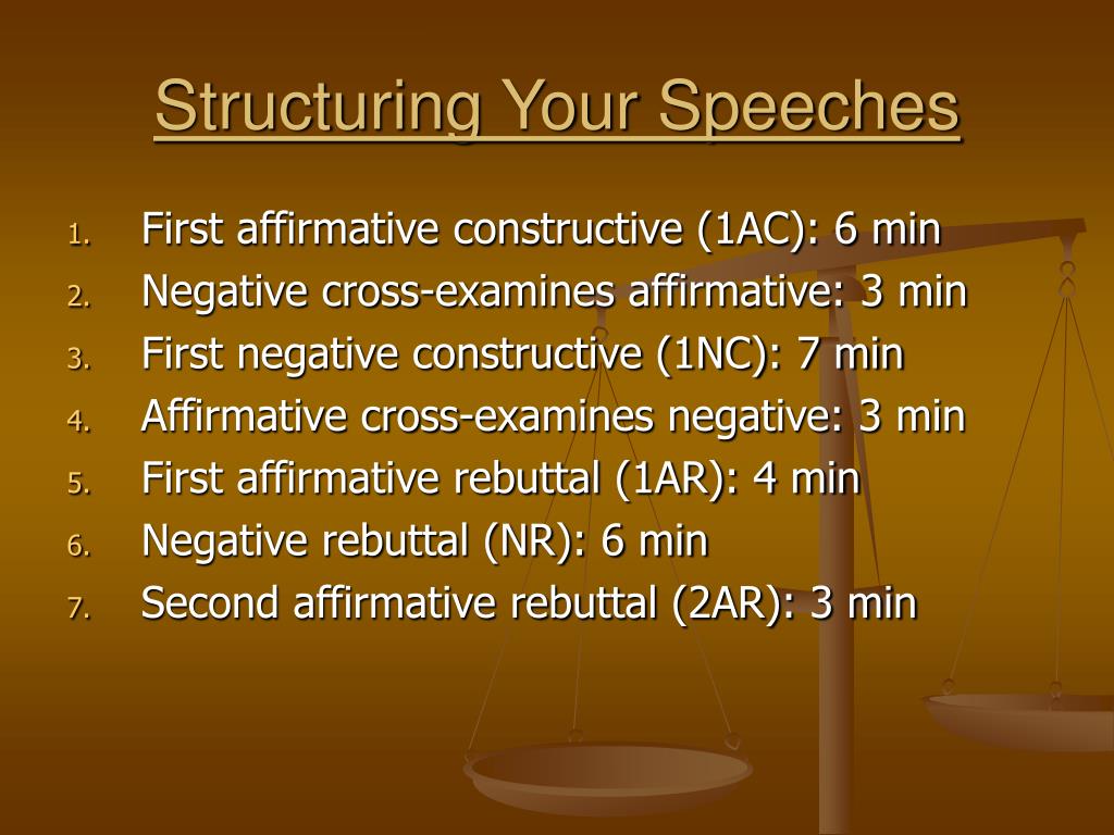 Structuring Your Speeches • First affirmative constructive (1AC): 6 min • Negative cross-examines affirmative: 3 min • First negative constructive (1NC): 7 min • Affirmative cross-examines negative: 3 min • First affirmative rebuttal (1AR): 4 min • Negative rebuttal (NR): 6 min • Second affirmative rebuttal (2AR): 3 min