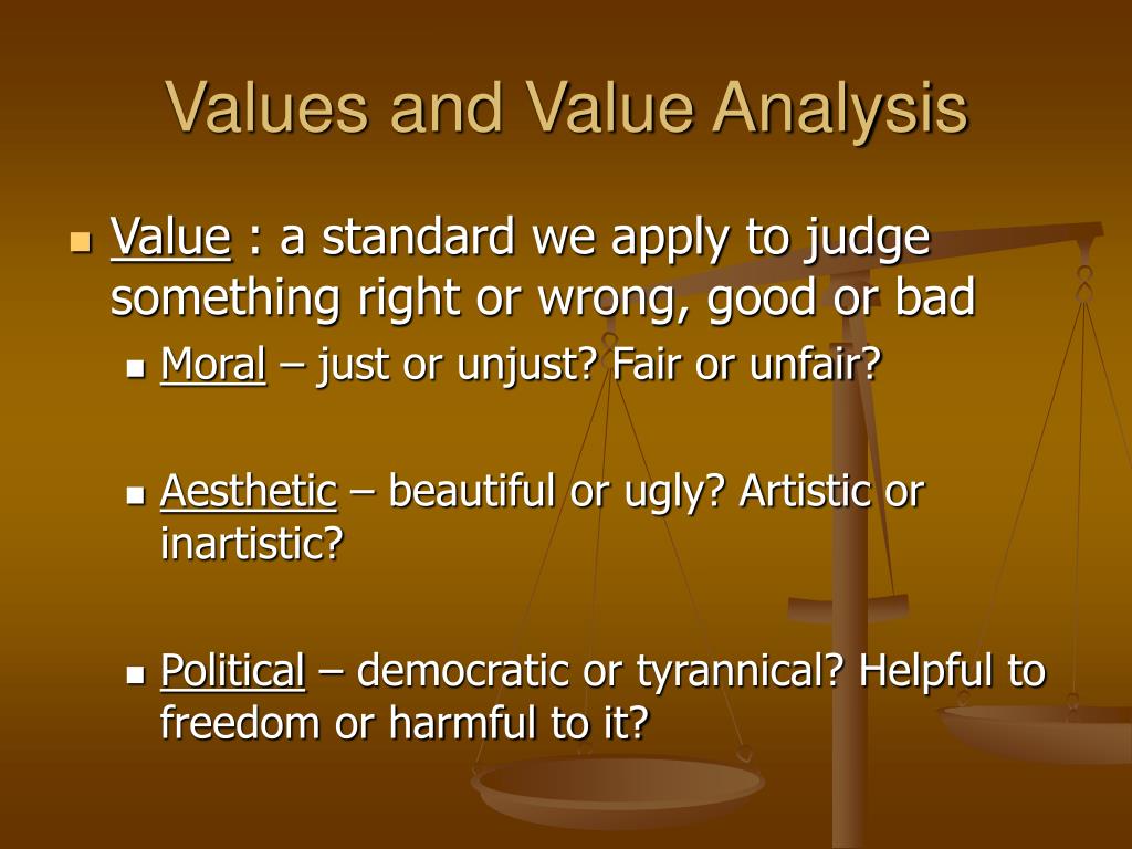 Values and Value Analysis • Value : a standard we apply to judge something right or wrong, good or bad • Moral – just or unjust? Fair or unfair? • Aesthetic – beautiful or ugly? Artistic or inartistic? • Political – democratic or tyrannical? Helpful to freedom or harmful to it?