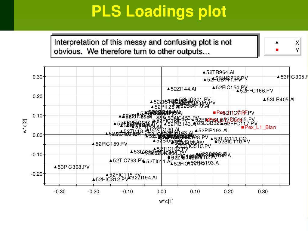 PLS Loadings plot Interpretation of this messy and confusing plot is not obvious. We therefore turn to other outputs…