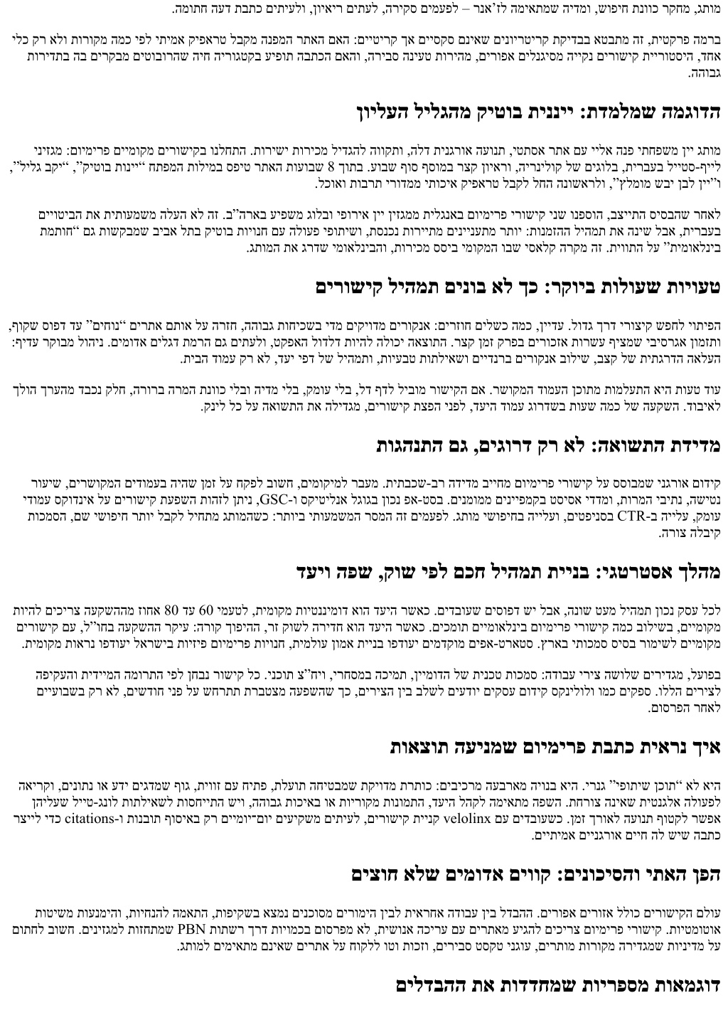 92-ב הלע ינגרוא קיפארט ,םישדוח 4 ךותב .םיימואלניבל זוחא 30 ,םיימוקמ םירתאל ונפוה העקשההמ זוחא 70 ,םישנל םוימירפ הנפוא טקיורפב תועצבמש תוגתוממ תוסינכ ורציו ,רוביצ יסחיל רקיעב ומרת םיימואלניבה םירושיקה .זוחא 1.6-ל 0.8-מ ץפק ינגרואהמ תורמה רועיש ,זוחא webinars-ל תותלד תחיתפו תילגנאב תותליאשב הדח החימצ האר ,ךופה ליהמת םע ,ריעצ רבייס פא-טראטס ,תאז תמועל .רתוי תולודג תושיכר .הינטירבבו ב”הראב תוריהמ תודוקנ שמח :השיכר ינפל תוכיא תוקידב ,תוקד 15-ב וילע ץורל רשפאש רצק ק’צ הנה .םינוכנה תומוקמב םילגד םירהל יאדכ ,רחא ףוגל םינופ וא םירושיק תיינק velolinx םיעצבמש ינפל :יניינק ילכל קימעהל ילב .המשנ רסח ”תובתכ לעפמ“ וא יתכירע ןכות רציימ רתאה םאה :םוסרפ בצק .דחא רוקמ לע ךמתסהל אל ,םילכ המכ קודבל :תרעושמ העונת לבקיו לחזיש םוקמב עיפות הבתכהש :תיטנוולר הירוגטק .יתכירע וק שיש וא ,שמשה תחת םוחת לכל הנפמ אוה םאה :אצוי םירושיק ליפורפ .ךורא בנז ייוטיבלו דנרבל לקשמ תתל ,ןוויג לע רומשל :יעבט רוקנא .יתימא קיפארט סנמרופרפ שגופ רושיקשכ :םיצורע בוליש תבתכ םוסרפ רחאל ,המגודל .םימסק השוע סנמרופרפל SEO ןיב הלועפ ףותיש .תקתונמ הדומע לאכ םירושיקל סחייתהל איה החיכש הצמחה ,ףסונב .ינגרואה CTR-ה תא תורפשמש תוינושאר תוסינכו םייתרבח םילנגיס רצייל לוכי תותשרב טסופל לילק ןמוממ םודיק ,תימואלניב םוימירפ .םיזוחא תורשעב CPA תיחפמ תובר םימעפו ,םינמוממ םינייפמקב תורמה רפשמ התיחנ יפדב הבתכה ךותמ םיטוטיצב שומיש םיצופנ םישיחרת יפל הקולח :המ םיאתמ ימל ןיילנוא תונח .תונימא רובע םיקזח תורוקממ םיילמס םיימואלניב םירושיק השולש-םיינש םע ,ימוקמל תופידע :קיטוב יתורישב ימוקמ הרקוי גתומ ימואלניב :םימדקומ םיבלשב B2B פא-טראטס .הקיטסיגולהו תוריכמה בצק יפל תימואלניב תובחרתה םע ,לוקש ליהמת :ל”וחלו לארשיל תרכומש .תוריכמל enablement יסכנ םג תורציימש קמוע תובתכב העקשה ,ךמות ימוקמ ,ליבומ ןועברל ילאיר לס םינוב דציכ :ביצקתה תלאש 6-ל םימגרותמש ,ח״ש ףלא 36 דע 18 תועמשמה ,ןועברל .םירושיקב םודיקל שדוחב ח״ש ףלא 12 דע 6 תוצקהל לוכי ינוניב-ןטק קסע ,ללכ ךרדב בושחש המ .הנטק תומכה םא םג ,רתוי תורקי לגד תובתכל גרדשל יאדכ ,הובג המורת חוורמ םע םיקסעב .תוכיאב יולת ,םירוכזא וא תובתכ 20 דע .קצומ סיסב םיקפסמ העשת דע השיש ,יוניש שיגרהל םומינימ םה םישדוח השולש :תויבקע אוה הלהנהל םירמוא המ :ימינפ תויפיצ םואית סקודניא רופיש - ינש שדוח ,םידדמב הטילקו תובתכ םוסרפ - ןושאר שדוח :ךרד ינבא לש תינכת גיצהל יאדכ .קדצבו ,םירפסמ םיבהוא םילהנמ תואמגוד םג אלא םיפרג קר אל תוארהל ,תוגצמב .גרדושמ הרמה לדומ - ישימח-יעיבר שדוח ,CTR-בו םימוקימב םייוניש - ישילש שדוח ,הליחזו .ישחומל ןייפמקה תא ךפוה הז .תוחוקל תובוגתו ,רוקיס יעטק ,ומסרפתהש תובתכל היצזילקול ףודעיתו תופש לע הלימ םירחוב .תורחא תורמה הפיצמ תינמרג לבא ,דובעת םימעפל ינמרג להקל תרבדמש תילגנאב הבתכ .הנפמה רתאהמ תוחפ אל הבושח הפשה תמאתה תיברע לולכל יאדכ םיתעל לבא ,הילאמ תנבומ תירבע ,לארשיב .דעי תופש ךשמהבו ,בחר ימואלניב קושל תילגנאב הלחתה :הרידחה בלש יפל הפש .בטיה ההזמ לגוגש לנגיס - םיינגרוא םיפותישל תורבתסהה תא הלידגמ היצזילקול .יתועמשמ דעי להק שישכ תיסורו ךרע לעב ןכותו SEO ,צ”חי ןיב רשקה ןכות סכנל תיקסע ךרד ןבא לכ ךופהל :טושפ ןויער .SEO תוכזב קמוע תולבקמ ךא ,צ”חי ךלהמ ךותמ םיתעל תודלונ םיקסעל םוימירפ תובתכ תולימ רציימ המישנ התואבו ,ךרוע ןיינעמש ימעפ דח רופיס םילבקמ ךכב .םירפסמ םע םישרמ סייק-טסט ,תוחוקל רקס ,שומיש ינותנ - יתימא .ןמז ךרואל םידבועש םיכלהמ לש DNA-ה הז .תויחמומ תסיפתו ,םירושיק ,חתפמ םיליחתמש ינפל לואשל המ :קפס לומ הדובע שי םאה ,ןכותה לע הטילשה תמר יהמ ,םירתאה םירחבנ דציכ :קודבל בושח ,רחא קפס לכ וא םירתא םודיק velolinx יתורישב םיניינעתמשכ םיכפוה הדידמ טרדנטסו תופיקש .תובנזמ תותליאשו סקודניא ,קיפארט ינותנ םע רדוסמ חוד םייקתמ םאהו ,ןמז ךרואל הבתכה תונימז לע תוירחא .הר