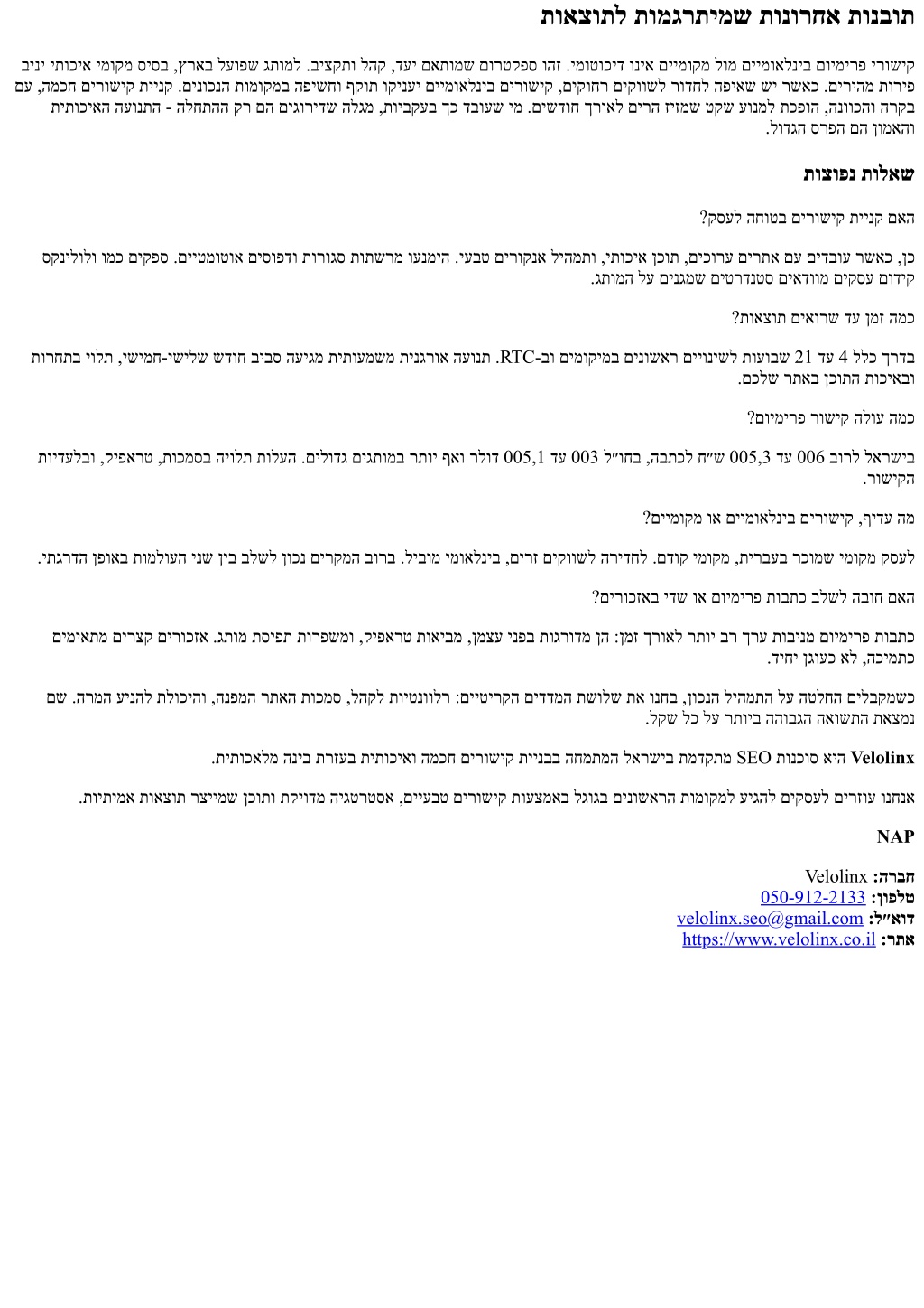 הווש דלונ קניל לכ אל :לגר תסירדכ םירושיק תוארנ - רורב דחא דעיו ,םימשונ םיפרג ,תינגרוא העונת חוליפ לע חותפ סקיטילנא ךסמ :תורחתה לש קפודה תא ריכמ ינתפאש גתומ להנמש ימ ןכות ירתאמ םייתוכיא םירושיק :לעופב החימצל תיזחת ןיב דירפהל ךישממש דחא ביכר שי ,SEO-ה תולועפ לולכמ ךותב .תואקסע האיבמש הביצי ,סקודניא בצקב םיזוחא תורשע לש םילדבהל םגרותמ אוה .יטרואית וניא םיימוקמ םירושיק תמועל םיימואלניב םוימירפ ירושיק ביבס חישה .םיקזח .קסעה לעבל תויתימא תויולעבו ,םישדח םיקוושל רודחל תלוכיב ,ןוכנ תלהונמ איהשכ הסג הלימ הניא םירושיק תיינקש יתדמל ,יאבודו ןודנול ,ןילרב דעו תיביבא-לתה הנצסהמ ,םינוש םיקוושב םיקסע הוולמש ימכ ןנכתל רשפא ,םיקסעל םוימירפ תובתכו םירושיקב םודיק יטקיורפב טרדנטס ביצמש ,םירתא םודיק velolinx ומכ ןוכנ קפס םע .יגטרטסא ילכ אלא .שער לע םיבאשמ ףורשל ילב ,םיגוחמ הזיזמש המכח העקשה םוימירפ רושיק ןתונ השעמל המ :תוכמסבש תונידעה עיגמש הזכ ,םוימירפ רושיק .שופיח יעונמ דצמ תיתכרעמ הרכהו ,ןכות תוכיא ,רשקה ,תוכמס ותיא אשונ אוה .”גוריד תדוקנ“ קר ונניא רושיק הייכזל רתוי הובג יוכיס ,םידומע לש רתוי הריהמ הליחז :רפרפ טקפא רציימ ,םיאירב תוכמס ידדמו יתימא להק לעב רתאב בטיה הכורע הבתכמ -ה דדמב קר אל דקמתמ ,לשמל ,סקנילולו םע םירושיקב םירתא םודיק .ןומא תוכזב רפושמ הרמה סחי םגו ,םינפמ קיפארט ,SERP לש םיר’ציפב .םוחתבו הפשב תיעבט תובלתשהו ,םיארוק ליפורפ ,סנרפרה תוכיאב םג אלא ,DA-ה וא DR סברופ רושיק ,ילארשי להקל תירבע רבוד הרקוי גתומ םינוב םתא םא םירושיק תיינב תוריש .גתומה תייגטרטסאל המאתה איה תערכמה הדוקנה רכומש פא-טראטס ,תאז לומ .תוימוקמה תואצותב רתוי רהמ טחמה זיזי תימוקמה השינב רתויב קזחה רתאהמ רוכזא לבא ,קירבהל לוכי ימואלניב .יתימא לייקס םיקפסמש םיקוושל םירשג םירצוי םיימואלניב םוימירפ ירושיק ןאכ .תימוקמה הכירבב קפתסי אל םלועל B2B ןורתפ תימוקמה הריזב רוחבל יתמ :יפרגואיגה סנאוינה .תימוקמ תויטנוולר אוה יתועמשמה תואה ,לארשי לגוגב .חתפמ תולימ תמישרמ רתוי תבכרומ הבושתה ,לגוגב ןושאר םוקמ תויהל ךיא םילאוששכ תיתרקוי הדעסמ .תימוקמ הנווכ םע תותליאשב תוארנ םיקזחמ ,ילארשי רשקהב תונורתפו תויעב לע םירבדמש ,תירבעב ןכות ירתאמ םירושיק ילארשי קיפארט םע םיימוקמ םירושיקמ רתוי םינהנ הלא - הילצרהב םידלי תנפואל םוימירפ תונח וא ,ןד שוגב ןיד יכרוע דרשמ ,ביבא תמרב .יטנוולר הזש ןכיה NAP לש ןוכנ בולישו ,יטנתוא יגתומ רוכזא ,יתימא ףידע .םוטנמומ םידבאמ ,ילארשי להקל הקיז ילד ךא ,םיצצונ םיימואלניב םימוסרפ לע ביצקת םירזפמש םיימוקמ םיקסע יכ תויבקעב האור ינא םירושיק הרשעב רשאמ ,תדפקומ הילאוזיוו תיניצר הכירע םע םיקסעל םוימירפ תובתכב ,תירבעב םיקזח םירוכזא השימח דע השולשב עיקשהל .ץראב טעמ םהב רבודמש םייללכ םירתאמ םיינבבוח םיחצנמ םיימואלניבה םירושיקה ןכיה :ימלוע םש לש וחוכ תופשב ןאכ דמל םיגוריד :םידממ ינשב הציפק םירציימ םיימואלניב םוימירפ ירושיק ,ץוח-םינפ תורייתו קטניפ ,תינוגרא הנכות ,הרקוי ירצומב קפסמ דעיה קושה לש םיליבומה םירתאב רוכזא ,תויורימאה דוחיא וא הינמרג ,ב”הראל רודחל שקבמ ילארשי רצומ רשאכ .גתומ תסיפתו תופסונ רקיעבו ,יתרפס-וד רועישב םיתיעל ,תורמהב ףקתשמ הזה ןומאה .”...ב רקוסש יפכ“ :תוריכמה תקלחמל תשומחת םג אלא ,SEO-ל לנגיס קר אל .תושיגפל תותלד חתופ .ןמז ךרואל תידותמ העמטהו יקנ ליפורפ שישכ דחוימב ,ןיימודה לש יללכ Trust רפשל רוזעל לוכי ימואלניב רושיק ,תירבעב םכלש רתאה םא םג ףוסבלו ,דעי קוש דקוממ ימואלניב גורדש ךכ רחא ,ימוקמ יתוכמס דוסי הליחת :תובכש תיינב לע ללכ ךרדב תססובמ םירושיק תיינק velolinx .תויחוור תוירוגטק ביבס יתדוקנ רודיס םילבקמ םצעב המו רושיק הלוע המכ :רבדמ ףסכ ,רתאה תוכמסל םאתהב ,הבתכל ח״ש 3,500 דע 600 תוביבסמ עונל לוכי לארשיב ימוקמ םוימירפ רושיק .םיבחר םירושיק תיינקב םיריחמה יחווט 300 תולעל לוכי יטנוולר ןיזגמב יתימא רושיק ,תימואלניבה הריז