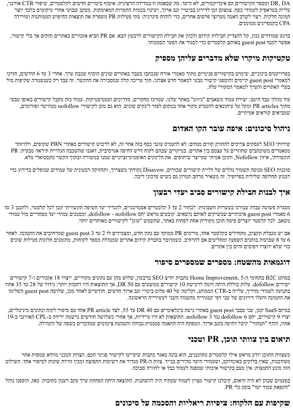 ,ינגרוא CTR רופיש ,םירטסלקל םישדח םייוטיב ףוסיא :תיניצרה הדידמב זז תמאבש המ .דעיה אל ,םירוטקידניא םה םירושיקה רפסמו DR, DA רצוי דבלב םימוקימ ירחא יעובש בקעמ .תותמואמה תורמהה תומכב יונישו ,ךורא בנז ייוטיבב גורידל ןמז םוצמצ ,ףסכ ידומעל קיפארטב היילע הדירומו תוגתוממה שופיחה תואצות תא תרפשמ PR תוליעפ יתמ :היגרניס תוהזל ידכ ,םירחא םוסרפ יצורעמ הטאד בלשל יוצר .תיקלח הנומת .םינמוממ םינייפמקב CPA ,רושיק ילב ךא םיקזח םירתאב םירוכזא איבה PR םא .אבה ןועברל םירושיקה תליבח תא ןווכלו םודיק תוליבח קידצהל לק ,ןוכנ םידדומש עגרב .יתוכמסה רעפה תא רוגסל ידכ םירטסלק םתואב guest post ףנמל רשפא קיפסמ ןהילע םירבדמ אלש ורקימ תוקיטקט ונרזח ,םישדוח 6 דע 3 ירחא .ךרע תבכש ףיסוה םינוש םירתאב רבעב ובתכנש חרוא ירמאמ ךותמ םיימינפ םירושיקב שומיש ,םיינוניב םיטקיורפב לומ תופיקש הרמשנשכ קר דבע הז .רשקהה תא הריבסמש הלק הכירע ךות ,ונלצא שדח רמאמל יעבט רושיק ונפסוהו םימייק guest post ירמאמל .הלע ירוקמה רמאמל ךרעהו םירתאה ילעב יעבט ןפואב םירושיק לבקמ הזכ דומע .תוקיטסיטטסו םיכירדמ ,םירקחמ זכרמש ,ונלש רתאב "טווינ" םיבאשמ דומע תריצי :בטיה דבע ךלהמ דוע ,םימורופו רטיווטמ nofollow ירושיקל בוט םג אוה .םינוש םיקניל רזפל םוקמב דחא רוקמ עימטהל םיאנותיע לע לקמו PR articles ךותמ .םייתימא םיארוק םיאיבמש םודאה וקה רבוע הפיא :םינוכיס לוהינ רהזיהלו ,םיפוקש PBN ירתאמ םירושיק שוכרל אל ,הז רחא הזב ףסכ ינגוע סימעהל אל :םיחנמ םיווק קיזחהל םיכירצ םיקסעל SEO יתוריש PR :תיעבט הארית תייולגה הבכשהש ונגאד ,תיביסרגא הפיחד שרד חוקל םהבש םירקימב .םירתא ןיב םמצע לע םירזוחש םיבתכושמ םירמאממ .אלמ ילאוטסקט רשקה ךותבו הרושמב ונמש םיינויצזימיטפואה םיקנילה תא .םיפותיש רציימש יתימא ןכותו ,Nofollow ןוזיא ,יתרושקת ידכ גורידב םילפונש םידומע לש תינועבר הקוזחתו ,ךירצשכ יתדוקנ Disavow ,םירובש םירושיק תיילד לש םילהנ רומשת הסונמ SEO תונכוס .הביל ינוכדע שישכ םג ןורמת בחרמ ריאשמ הז .ליפורפב תילילש הפולחת עונמל ןועבר ידעי ביבס םירושיק תליבח תונבל ךיא דע 3 ןנכתלו ,רטסלק לכל ןטק יתרושקת הפישח דעי רידגהל ,םייגטרטסא םירטסלק 3 דע 2 רוחבל :תונובשח תורשעב ונרובע הדבע הטושפ תרגסמ ידומע לומ םיירחסמ דעי ידומע םינמסמו ,dofollow - nofollow סחי שארמ םיעבוק .םיאשונ םתואל םיקישמש םייתוכיא guest post ירמאמ 6 .רתוי םירחואמ םירושיקל "ןגוע" שמשתש ,רתאב תוחפל תחא תירוקמ ןכות תסיפ םירצוי רטסלק לכל .באשמ רחאל .הנומתה תא םיביחרמש guest post 3 דע 2 ול םידימצמו ,שדח ןותנ םע דקוממ PR םימירמ ,דחא רטסלקב םיליחתמ ,ביצקת תלבגמ שי םא םינוש תוליעפ תונולח םינמזתמ ,תוחוקל רפסמ תלהנמש םירתא םודיק תרבחב רבודמשכ .ביחרהל םא םיטילחמו העפשה םינחוב תועובש 8 דע 6 .םירתא ןיב םיהז םיסופד ורצווי אלש ידכ רופיס םירפסמש םירפסמ :חטשהמ תואמגוד םירושיק 7-ו םירוכזא 18 ורציי ,םיירוקמ םינותנ םע ןהמ שולש ,ןועברב SEO צ״חי תובתכ Home Improvement, 5-ה ימוחתב B2C גתומב זוחא 35 דע 28 לש לודיג :רתוי תובחר ויה תואצותה ךא ,DR 50 םע םיעצוממ םירושיק 10 תשיכרל המוד התיה תללוכ תולע .dofollow םירישי ומילשה guest post השולש ,ןכמ רחאל םיישדוח .םישדח ךורא בנז ייוטיב סולפ 40 לש הטילקו ,גתוממה CTR-ב היילע ,ךירדמ ידומעל העונתב .הנושארה היירישעל ינשה דומעהמ הירוגטק יפד ינש לש םיגוריד ולעהו הנומתה תא ,םיילמינימ םינותנו חוקל רופיס םע דחא PR article דצל ,55 דע DR 40 םע םיימואלניב השינ ירתאב guest post יבבס ינש ,ןטק SaaS םזימב 19-ב ינגרואה CPL-ב הדירי המשרנ םישדוח השולשכ ירחא ךא ,תוידיימ ויה אל תואצותה .nofollow 3 דגנ dofollow 6 סחי ,םירושיק 9 ורצי .הליהקה לש הפשב םירבדמש םיטוטיצ תעמטהו ההובג תיטנמס המאתה היה חתפמה .ךורא בנזב הפיחד לביק "רוחמת" ףדהו ,זוחא ינכטו PR ,ןכות יתווצ ןיב םואית רתא תופמש אדוומ ינכטה תווצה .םכח ימינפ רושיקל ועייסיש תובתכ רגאמ הנוב אוה ,םיננכותמ םירטסלק וליא שארמ עדוי ןכותה תווצשכ בולישה .דחא רופיסל תונוש תויווז ןיכמו הצופתה תומישר תא ר