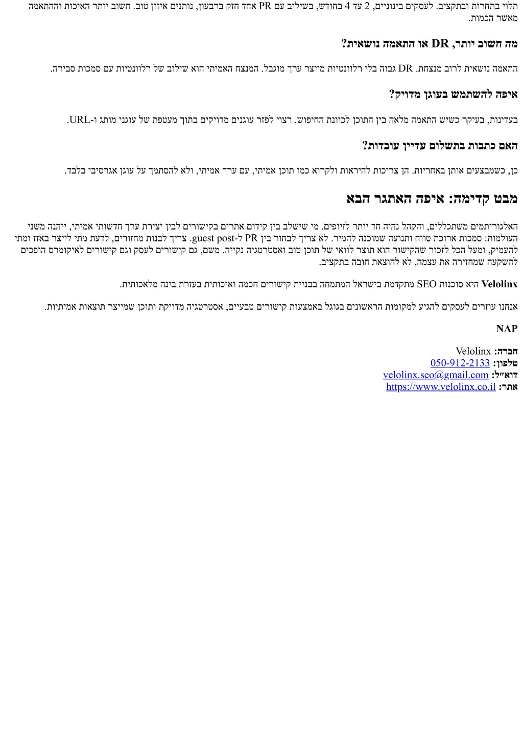 המאתההו תוכיאה רתוי בושח .בוט ןוזיא םינתונ ,ןועברב קזח דחא PR םע בולישב ,שדוחב 4 דע 2 ,םיינוניב םיקסעל .ביצקתבו תורחתב יולת .תומכה רשאמ ?תיאשונ המאתה וא DR ,רתוי בושח המ .הריבס תוכמס םע תויטנוולר לש בוליש אוה יתימאה חצנמה .לבגומ ךרע רציימ תויטנוולר ילב הובג DR .תחצנמ בורל תיאשונ המאתה ?קיודמ ןגועב שמתשהל הפיא .URL-ו גתומ ינגוע לש תפטעמ ךותב םיקיודמ םינגוע רזפל יוצר .שופיחה תנווכל ןכותה ןיב האלמ המאתה שישכ רקיעב ,תונידעב ?תודבוע ןיידע םולשתב תובתכ םאה .דבלב יביסרגא ןגוע לע ךמתסהל אלו ,יתימא ךרע םע ,יתימא ןכות ומכ אורקלו תואריהל תוכירצ ןה .תוירחאב ןתוא םיעצבמשכ ,ןכ אבה רגתאה הפיא :המידק טבמ ינשמ הנהיי ,יתימא יתושדח ךרע תריצי ןיבל םירושיקב םירתא םודיק ןיב בלשיש ימ .םיפויזל רתוי דח היהנ להקהו ,םיללכתשמ םימתירוגלאה יתמו זזאב רצייל יתמ תעדל ,םירוזחמ תונבל ךירצ .guest post-ל PR ןיב רוחבל ךירצ אל .רימהל הנכומש העונתו חווט תכורא תוכמס :תומלועה םיכפוה סרמוקיאל םירושיק םגו קסעל םירושיק םג ,םשמ .הייקנ היגטרטסאו בוט ןכות לש יאוול רצות אוה רושיקהש רוכזל לכה לעמו ,קימעהל .ביצקתב הבוח תאצוהל אל ,המצע תא הריזחמש העקשהל .תיתוכאלמ הניב תרזעב תיתוכיאו המכח םירושיק תיינבב החמתמה לארשיב תמדקתמ SEO תונכוס איה Velolinx .תויתימא תואצות רציימש ןכותו תקיודמ היגטרטסא ,םייעבט םירושיק תועצמאב לגוגב םינושארה תומוקמל עיגהל םיקסעל םירזוע ונחנא NAP Velolinx :הרבח 050-912-2133:ןופלט velolinx.seo@gmail.com:ל״אוד https://www.velolinx.co.il:רתא