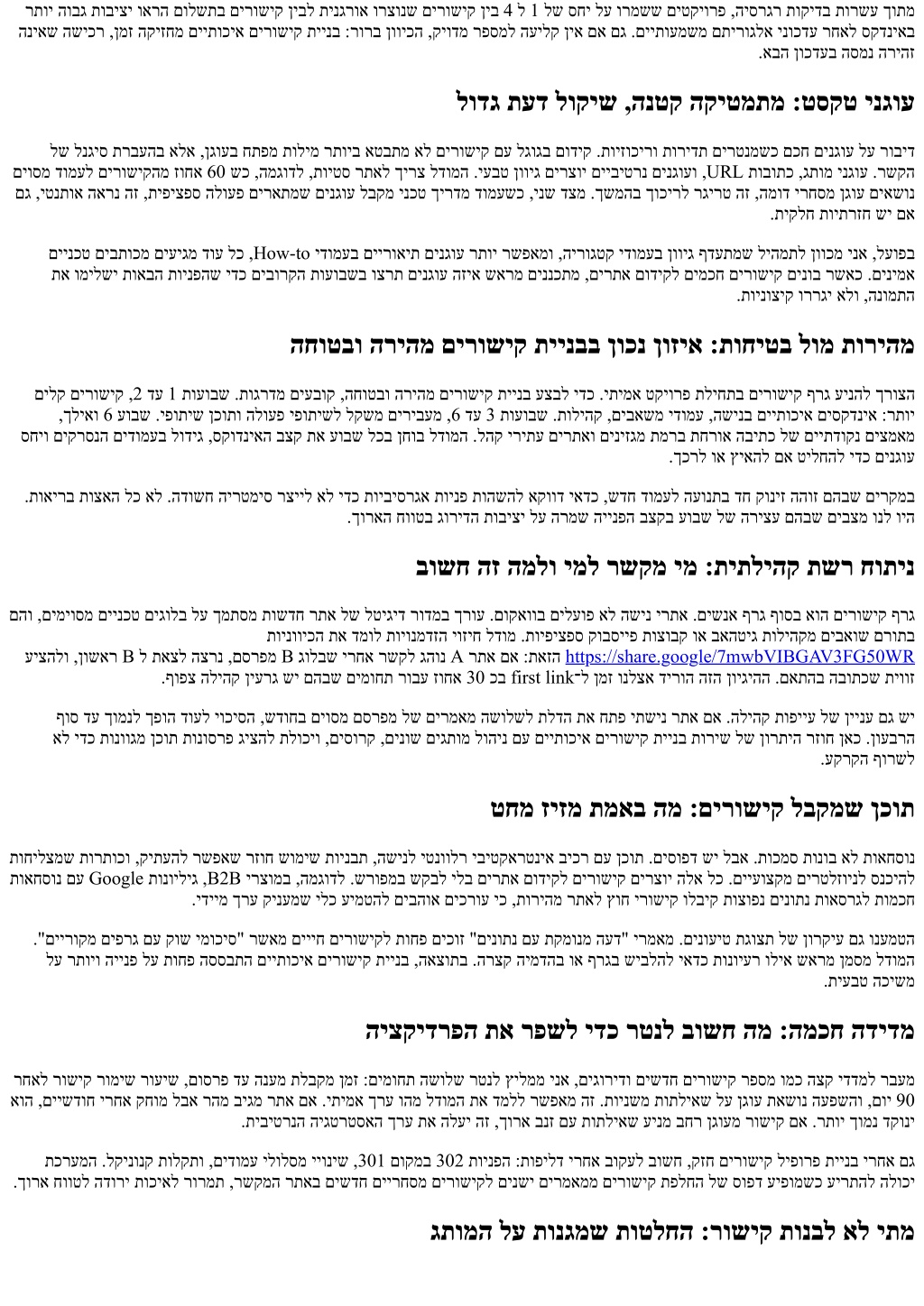 רתוי הובג תוביצי וארה םולשתב םירושיק ןיבל תינגרוא ורצונש םירושיק ןיב 4 ל 1 לש סחי לע ורמשש םיטקיורפ ,היסרגר תוקידב תורשע ךותמ הניאש השיכר ,ןמז הקיזחמ םייתוכיא םירושיק תיינב :רורב ןוויכה ,קיודמ רפסמל העילק ןיא םא םג .םייתועמשמ םתירוגלא ינוכדע רחאל סקדניאב .אבה ןוכדעב הסמנ הריהז לודג תעד לוקיש ,הנטק הקיטמתמ :טסקט ינגוע לש לנגיס תרבעהב אלא ,ןגועב חתפמ תולימ רתויב אטבתמ אל םירושיק םע לגוגב םודיק .תויזוכירו תורידת םירטנמשכ םכח םינגוע לע רוביד םיוסמ דומעל םירושיקהמ זוחא 60 שכ ,המגודל ,תויטס רתאל ךירצ לדומה .יעבט ןוויג םירצוי םייביטרנ םינגועו ,URL תובותכ ,גתומ ינגוע .רשקה םג ,יטנתוא הארנ הז ,תיפיצפס הלועפ םיראתמש םינגוע לבקמ ינכט ךירדמ דומעשכ ,ינש דצמ .ךשמהב ךוכירל רגירט הז ,המוד ירחסמ ןגוע םיאשונ .תיקלח תויתרזח שי םא םיינכט םיבתוכמ םיעיגמ דוע לכ ,How-to ידומעב םיירואית םינגוע רתוי רשפאמו ,הירוגטק ידומעב ןוויג ףדעתמש ליהמתל ןווכמ ינא ,לעופב תא ומילשי תואבה תוינפהש ידכ םיבורקה תועובשב וצרת םינגוע הזיא שארמ םיננכתמ ,םירתא םודיקל םימכח םירושיק םינוב רשאכ .םינימא .תוינוציק וררגי אלו ,הנומתה החוטבו הריהמ םירושיק תיינבב ןוכנ ןוזיא :תוחיטב לומ תוריהמ םילק םירושיק ,2 דע 1 תועובש .תוגרדמ םיעבוק ,החוטבו הריהמ םירושיק תיינב עצבל ידכ .יתימא טקיורפ תליחתב םירושיק ףרג עינהל ךרוצה ,ךליאו 6 עובש .יפותיש ןכותו הלועפ יפותישל לקשמ םיריבעמ ,6 דע 3 תועובש .תוליהק ,םיבאשמ ידומע ,השינב םייתוכיא םיסקדניא :רתוי סחיו םיקרסנה םידומעב לודיג ,סקודניאה בצק תא עובש לכב ןחוב לדומה .להק יריתע םירתאו םיניזגמ תמרב תחרוא הביתכ לש םייתדוקנ םיצמאמ .ךכרל וא ץיאהל םא טילחהל ידכ םינגוע .תואירב תוצאה לכ אל .הדושח הירטמיס רצייל אל ידכ תויביסרגא תוינפ תוהשהל אקווד יאדכ ,שדח דומעל העונתב דח קוניז ההוז םהבש םירקמב .ךוראה חווטב גורידה תוביצי לע הרמש היינפה בצקב עובש לש הריצע םהבש םיבצמ ונל ויה בושח הז המלו ימל רשקמ ימ :תיתליהק תשר חותינ םהו ,םימיוסמ םיינכט םיגולב לע ךמתסמ תושדח רתא לש לטיגיד רודמב ךרוע .םוקאווב םילעופ אל השינ ירתא .םישנא ףרג ףוסב אוה םירושיק ףרג תוינוויכה תא דמול תויונמדזה יוזיח לדומ .תויפיצפס קובסייפ תוצובק וא באהטיג תוליהקמ םיבאוש םרותב עיצהלו ,ןושאר B ל תאצל הצרנ ,םסרפמ B גולבש ירחא רשקל גהונ A רתא םא :תאזה https://share.google/7mwbVIBGAV3FG50WR .ףופצ הליהק ןיערג שי םהבש םימוחת רובע זוחא 30 כב first link־ל ןמז ונלצא דירוה הזה ןויגיהה .םאתהב הבותכש תיווז ףוס דע ךומנל ךפוה דועל יוכיסה ,שדוחב םיוסמ םסרפמ לש םירמאמ השולשל תלדה תא חתפ יתשינ רתא םא .הליהק תופייע לש ןיינע םג שי אל ידכ תונווגמ ןכות תונוסרפ גיצהל תלוכיו ,םיסורק ,םינוש םיגתומ לוהינ םע םייתוכיא םירושיק תיינב תוריש לש ןורתיה רזוח ןאכ .ןועברה .עקרקה ףורשל טחמ זיזמ תמאב המ :םירושיק לבקמש ןכות תוחילצמש תורתוכו ,קיתעהל רשפאש רזוח שומיש תוינבת ,השינל יטנוולר יביטקארטניא ביכר םע ןכות .םיסופד שי לבא .תוכמס תונוב אל תואחסונ תואחסונ םע Google תונויליג ,B2B ירצומב ,המגודל .שרופמב שקבל ילב םירתא םודיקל םירושיק םירצוי הלא לכ .םייעוצקמ םירטלזוינל סנכיהל .ידיימ ךרע קינעמש ילכ עימטהל םיבהוא םיכרוע יכ ,תוריהמ רתאל ץוח ירושיק ולביק תוצופנ םינותנ תואסרגל תומכח ."םיירוקמ םיפרג םע קוש ימוכיס" רשאמ םיייח םירושיקל תוחפ םיכוז "םינותנ םע תקמונמ העד" ירמאמ .םינועיט תגוצת לש ןורקיע םג ונעמטה לע רתויו היינפ לע תוחפ הססבתה םייתוכיא םירושיק תיינב ,האצותב .הרצק הימדהב וא ףרגב שיבלהל יאדכ תונויער וליא שארמ ןמסמ לדומה .תיעבט הכישמ היצקידרפה תא רפשל ידכ רטנל בושח המ :המכח הדידמ רחאל רושיק רומיש רועיש ,םוסרפ דע הנעמ תלבקמ ןמז :םימוחת השולש רטנל ץילממ ינא ,םיגורידו םישדח םירושיק רפסמ ומכ הצק ידדמל רבעמ אוה ,םיישדוח ירחא קחומ לבא רהמ ביגמ רתא םא .יתימא ךרע והמ לדומה תא דמלל רשפאמ הז .תוינשמ תותליאש לע ןגוע תאשונ העפשהו ,םו