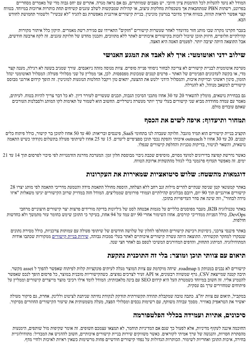 םיירחסמ םירמאמ לש ידמ הובג סחי םע םירתא .הרגמ הארנ םא םג ,םירתוומש םיבצמ שי .יבויח ןויצ תונמדזה לכל תולעהל דעונ אל לדומה חווטב .דחוימב תוכורא תורתוכ תחת םיחישק םינגוע בלשל תושקבמש תוליהק וא ,בוציע תוקלחמ תולפכשמ ךא תואבחתמש PBN תותשר ,טנורפב שדוחל תשומחת רומשלו "וישכע אל" דיגהל םג תרשפאמ תינגרוא םירושיק תיינב .ןיטינומ ןוערגב רבודמ ךורא חווטב ,הזוזת תוארל רשפא רצק .אבה תורוקמ רותיא ללכ ןוקית .םירמאמ תשר תריגס םע ודייאתה "םיקזח" םירושיק תורשעש רחאל רדעודמ רזח גתומ ובש הרקמ ונרקח רבעב ,םישדוח העברא חקל הז .םינגוע תקולח לש שדחמ ןונכתו ,םיכוותמ אלל רתאל םייתוכיא םירושיקב תוכזל לוכיש ןכות קוזיח ,םייפולח םייתליהק .הצאה איה הטאה םימעפל .רתוי הביצי התיה האצותה לבא ישונאה עגמה תא דבאל אל ךיא :יטמוטואו ינדי בוליש רצק הנעמ ,הליגר אל העשב ביגמש ךרוע .םיסנאוינ ההזמ הסונמ תווצ .םייפוס היינפ יחוסינ רוחבל הכירצ אל םירושיק תיינבל תיטמוטוא תכרעמ להני יטמוטואה לולסמה :הלועפ ילולסמ ינש לע ץילממ ינא ,ןכל .תוספספמ תונוכמש םינטק םיטרפ - רתאה לש םיימינפה םינוכדעל השקב וא ,ידמ ססובמ ינגרוא םודיק ךפוה הז .ןיטינומל תועגונה תוטלחה לבקיו ןוט םיאתי ,העצהה תא שטלי ינדיה לולסמהו ,תוכיא תוקידבו ינושאר ןוניס ,ןומזת .הלרגהל אל ,להונמ באשמל םירושיק ,םיתיעל .חוטב תויהל ךירצ רבד לכ אל .ןויד ררועל םייושעש םינכת ,הובגה ןוכיסה ינכתמ זוחא 30 דע 20 ריאשהל ץלמומ ,םיאשונ תריחבב םג םיכרועה תונלבסלו גתומה וקל תומיאת לע רומשל אוה בושחה .םיילרטינ הרשעמ רתוי ךרע ילעב םירושיק ינש איבמ תדדוחמ הדמע םע רמאמ .םלומ םידבוע םתאש ףסכה תא םישל הפיא :ףודעיתו רוחמת םילכ חותיפ ללוכ ,רושיק רב ןכותל זוחא 50 דע 40 :תואירבו םיסנניפ ,SaaS ימוחתב ונל הדבעש הקולח .לבגומ דימת אוה םירושיק תיינב ביצקת המאתה שישכ יתדוקנ םולשתב הלועפ יפותישל זוחא 25 דע 15 .םידעיל םייפיצפס ןכות יסכנ תקפהו יתוכיא outreach ל זוחא 30 דע 20 .םינטק .ולפנש םירושיק תפלחהו תוינכט תוקידב ,רוטינל ראשהו ,תיאשונ 21 דע 14 ךות םוסרפל יוכיס יפל תויונמדזה תגרדמ תכרעמה :ןמז ןולח תססובמ יובינ תבכש םיפיסומ ,םיוסמ דעומל םיגורידב הציפק תשרדנ רשאכ .חווטה תכורא תיתשתהמ לוזגל ילב יטמגרפ ףודעת רשפאמ הז .םימי תונורקעה תא תוריאמש תויצאוטיס שולש :חטשהמ תואמגוד 28 ורצי גתומ יפל המאתה יכירדמ תעמטהו הדימ תמאתה ללוחמ תפסוה ,החלצה אלל בחר בנז תולימ םירהל םייתנש הסינש ןטק יאנועמק רתאב וזיא" תולאשמ ועיגי םירושיקה בורש קיודמב הזח לדומה .םיצילממש םימורופ ידומעו םייתליהק םיגולבמ םבור ,םוי 90 ךות םיינגרוא םירושיק .ןכותב תויופידעה רדס תא הניש הזו ,"רוחבל הדימ יבחרמ םיינוציח םירושיק רצי תוצרפ םידירומ הקידב תונויליג לש טסל החטבא תומגמ לע םייללכ םיטסופמ רבעמ ,B2B היגולונכט רתאב תושדחכ אלו ךשמתמ רזע רמוחכ שמיש ןכותה יכ רקיעב ,זוחא 94 לע דמע םוי 90 ירחא רומישה זוחא .םיסרוק יכירדממ תוינפה ללוכ ,DevOps .תופלוח םינותנ תריסמ ללוכ ,תוינכרצ תותומע םע הלועפ יפותיש לש םישדוח השולש לש ןולחל ופלחתה םירושיק תשיכר תונויסינ ,ינכרצ יסנניפ רתאב תודוא ובתכש תורוקממ םירושיק תיינב תוריש ,ההובג תוכמס ילעב רתאל םייתוכיא םירושיק הרשע התיה האצותה .יתרושקת רקחמל ורקסנש .הנש יצח רחאל םג ספטל וכישמה םיגרודמה םיפדהו ,קזחתה גותימה .היגולודותמה תעקתנ תינכותה הז ילב :רצומו ןכות יתווצ םע םואית .רשקמ asset ל ךופהל רשפאש חותיפל תולק תויצקנופ םיתיעל הלגמ רצומה תווצ םע תמדקומ החיש .roadmap מ קתונמב םינבנ אל םירושיק רשפאש סכנל ךפוה םוסרפ לכ ,רצומב תינבומ תוירושיקהשכ .םיצופנ םיכרצל ריעז API וא ,םינועבר הוושמש ףרג ,CSV תאציימש הנטק הבית לע ץילממו םירושיק םירציימ רצומ יביכר וליא דמול לדומה :תיתוכאלמ הניב םע SEO םודיק איה לעה תרטמשכ דחוימב בושח הז .וילא עימטהל .תיקסע םג ךרע םיריזחמש םיחותיפ הלועמ רוקיס םג ,תרחא .קניללו טוטיצל תנתינש התיחנ תדוקנל קקדזת תיתרושקת הדוהת תלבקמש הבוט