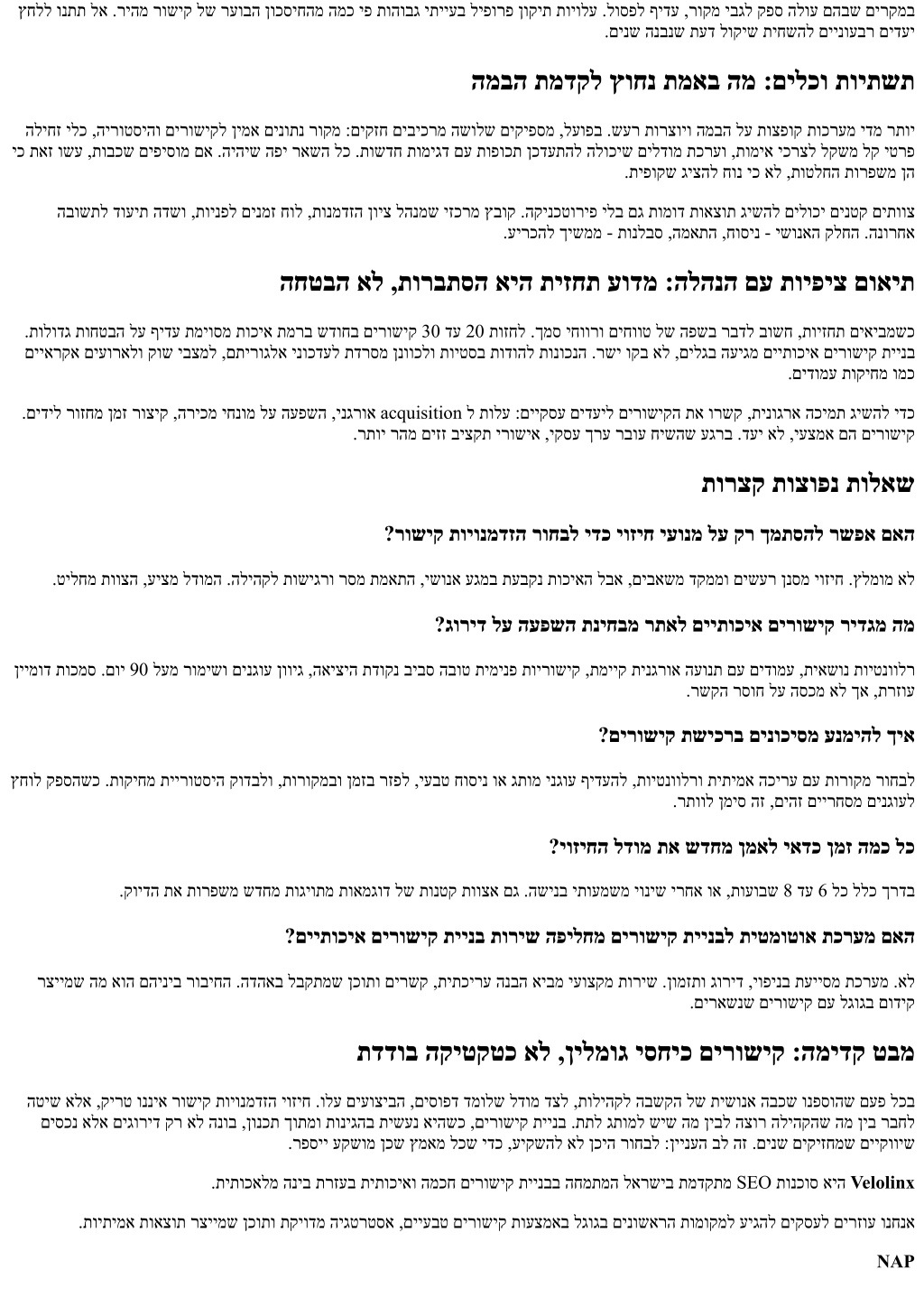 ץחלל ונתת לא .ריהמ רושיק לש רעובה ןוכסיחהמ המכ יפ תוהובג יתייעב ליפורפ ןוקית תויולע .לוספל ףידע ,רוקמ יבגל קפס הלוע םהבש םירקמב .םינש הנבנש תעד לוקיש תיחשהל םיינועבר םידעי המבה תמדקל ץוחנ תמאב המ :םילכו תויתשת הליחז ילכ ,הירוטסיהו םירושיקל ןימא םינותנ רוקמ :םיקזח םיביכרמ השולש םיקיפסמ ,לעופב .שער תורצויו המבה לע תוצפוק תוכרעמ ידמ רתוי יכ תאז ושע ,תובכש םיפיסומ םא .היהיש הפי ראשה לכ .תושדח תומיגד םע תופוכת ןכדעתהל הלוכיש םילדומ תכרעו ,תומיא יכרצל לקשמ לק יטרפ .תיפוקש גיצהל חונ יכ אל ,תוטלחה תורפשמ ןה הבושתל דועית הדשו ,תוינפל םינמז חול ,תונמדזה ןויצ להנמש יזכרמ ץבוק .הקינכטוריפ ילב םג תומוד תואצות גישהל םילוכי םינטק םיתווצ .עירכהל ךישממ - תונלבס ,המאתה ,חוסינ - ישונאה קלחה .הנורחא החטבה אל ,תורבתסה איה תיזחת עודמ :הלהנה םע תויפיצ םואית .תולודג תוחטבה לע ףידע תמיוסמ תוכיא תמרב שדוחב םירושיק 30 דע 20 תוזחל .ךמס יחוורו םיחווט לש הפשב רבדל בושח ,תויזחת םיאיבמשכ םייארקא םיעוראלו קוש יבצמל ,םתירוגלא ינוכדעל תדרסמ ןנווכלו תויטסב תודוהל תונוכנה .רשי וקב אל ,םילגב העיגמ םייתוכיא םירושיק תיינב .םידומע תוקיחמ ומכ .םידיל רוזחמ ןמז רוציק ,הריכמ יחנומ לע העפשה ,ינגרוא acquisition ל תולע :םייקסע םידעיל םירושיקה תא ורשק ,תינוגרא הכימת גישהל ידכ .רתוי רהמ םיזז ביצקת ירושיא ,יקסע ךרע רבוע חישהש עגרב .דעי אל ,יעצמא םה םירושיק תורצק תוצופנ תולאש ?רושיק תויונמדזה רוחבל ידכ יוזיח יעונמ לע קר ךמתסהל רשפא םאה .טילחמ תווצה ,עיצמ לדומה .הליהקל תושיגרו רסמ תמאתה ,ישונא עגמב תעבקנ תוכיאה לבא ,םיבאשמ דקממו םישער ןנסמ יוזיח .ץלמומ אל ?גוריד לע העפשה תניחבמ רתאל םייתוכיא םירושיק רידגמ המ ןיימוד תוכמס .םוי 90 לעמ רומישו םינגוע ןוויג ,האיציה תדוקנ ביבס הבוט תימינפ תוירושיק ,תמייק תינגרוא העונת םע םידומע ,תיאשונ תויטנוולר .רשקה רסוח לע הסכמ אל ךא ,תרזוע ?םירושיק תשיכרב םינוכיסמ ענמיהל ךיא ץחול קפסהשכ .תוקיחמ תיירוטסיה קודבלו ,תורוקמבו ןמזב רזפל ,יעבט חוסינ וא גתומ ינגוע ףידעהל ,תויטנוולרו תיתימא הכירע םע תורוקמ רוחבל .רתוול ןמיס הז ,םיהז םיירחסמ םינגועל ?יוזיחה לדומ תא שדחמ ןמאל יאדכ ןמז המכ לכ .קוידה תא תורפשמ שדחמ תוגיותמ תואמגוד לש תונטק תווצא םג .השינב יתועמשמ יוניש ירחא וא ,תועובש 8 דע 6 לכ ללכ ךרדב ?םייתוכיא םירושיק תיינב תוריש הפילחמ םירושיק תיינבל תיטמוטוא תכרעמ םאה רציימש המ אוה םהיניב רוביחה .הדהאב לבקתמש ןכותו םירשק ,תיתכירע הנבה איבמ יעוצקמ תוריש .ןומזתו גוריד ,יופינב תעייסמ תכרעמ .אל .םיראשנש םירושיק םע לגוגב םודיק תדדוב הקיטקטכ אל ,ןילמוג יסחיכ םירושיק :המידק טבמ הטיש אלא ,קירט ונניא רושיק תויונמדזה יוזיח .ולע םיעוציבה ,םיסופד דמולש לדומ דצל ,תוליהקל הבשקה לש תישונא הבכש ונפסוהש םעפ לכב םיסכנ אלא םיגוריד קר אל הנוב ,ןונכת ךותמו תוניגהב תישענ איהשכ ,םירושיק תיינב .תתל גתומל שיש המ ןיבל הצור הליהקהש המ ןיב רבחל .רפסיי עקשומ ןכש ץמאמ לכש ידכ ,עיקשהל אל ןכיה רוחבל :ןיינעה בל הז .םינש םיקיזחמש םייקוויש .תיתוכאלמ הניב תרזעב תיתוכיאו המכח םירושיק תיינבב החמתמה לארשיב תמדקתמ SEO תונכוס איה Velolinx .תויתימא תואצות רציימש ןכותו תקיודמ היגטרטסא ,םייעבט םירושיק תועצמאב לגוגב םינושארה תומוקמל עיגהל םיקסעל םירזוע ונחנא NAP
