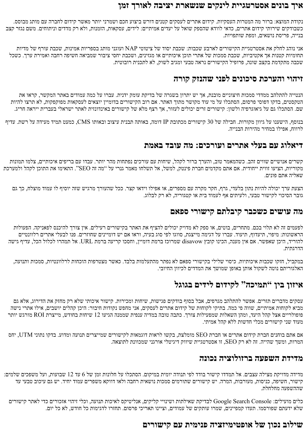 ןמז ךרואל הביצי תראשנש םיקניל תייגטרטסא םינוב ךיא .ססובמ גתומ םע הרבחל םודיק רשאמ רתוי ינרמשו םכח עוציב שרוד םינטק םיקסעל םירתא םודיק .תויקסעה תורטמה המ רורב :אצומה תדוקנ בצק רזגנ םשמ .םיחותינו םידדמ קר אלו ,תונמזה ,תואקסע ,םידיל :םייתימא םידעי לע לאוש קפסהש אדוול יאדכ ,םירתא םודיק יתוריש םיקדובשכ .תויופתוש תפמו ,םיאשונ תסירפ ,היינב תוידמ לש ףרוע תבכש ,תונימא תוירפסב גתומ ינגועו NAP יטוטיצ לש דוסי תבכש :תובכש עבראל םירושיקה תייגטרטסא תא קלחל גהונ ינא לכשכ .ךרע תרימאו הבחר הפישח האיבמש רוביצ יסחי תבכשו ,םיניזגמ וא םייתוכיא ןכות ירתא לש תוכמס תבכש ,תויביטקא ךא תונטק תוימוחת .תיטובור תינכתל אל ,קושל ביגמו יעבט הארנ םירושיקה ליפורפ ,הנוש בצקב תמדקתמ הבכש הרוק קזנהש ינפל םינוכיס תכרעהו יוהיז תא וארק ,רשקמה רתאב םידומע המכ לע ורבע .תינדי קמוע תקידב לש הרגשב ןורתי שי ךא ,תנבומ םיינוציח תוכמס ידדממ בהלתהל הייטנה תויהל וצרת אל ,תוקפקופמ תואקסעל םיאצוי ןיימודב םירושיקה בור םא .רתאה ךותמ רשוקמ דוע ימ לע ולכתסה ,םוסרפ יסופד וקדב ,םיטסקטה .גירח האריי תירבעב ילארשי רתאל תיזנודניאב םירושיק לש אלמ ףצר ךא ,רוזעל םילוכי םירז םירושיק :ןושלו היפרגואיג לע םג ולכתסה .םש ףידע .תשר לע הדיעמ דימת טעמכ ,CMS ותואבו בוציע תינבת התואב ,המוד IP תבותכמ םירושיק 30 לש הליבח .תורוקמ ןוויג לע ונעשיה ,ףסונב .היינבה תוריהמ ריחמב וליפא ,חוורל תמאב דבוע המ :םיכרועו םירתא ילעב םע גולאיד תונומת ומלצ ,םייתוכיא םיפירב םע ודבע .רתוי רהמ תוחתפנ םיכרוע םע תוחיש ,להקל רורב ךרעהו ,בוט רמאמהשכ .בהז םיווש םיישונא םירשק תכרעמלו להקל ןכותה תא ומיאתה .”SEO הז המ“ לע ירנג רמאמ וחלשת לא ,לשמל ,קטניפ תרבח םימדקמ םתא םא .תידוחיי תיווז ועיצה ,תוירוקמ .םינופ םתא הילאש םג ךכ ,חלצומ דומע ול ףיסוי הזש שיגרמ ךרועהש לככ .רצק ואדיו וליפא וא ,םירפסמ םע הרקמ רקח ,ףרג ,ידעלב ןותנ תויהל הלוכי ךרע תעצה .גולבל קר אל ,הירוגטק וא תיב דומעל ףא םיתיעלו ,יעבט רושיקל יוכיסה רבוג םאפס ירושיק םתלביק רבכשכ םישוע המ תולועפה .הקינאפל סנכיהל ךרוצ ןיא .םיליער םירושיקב רתאה תא ףיצהל םילוכי קיודמ אל קפס וא ,םיטוב ,םירחתמ .םכב יולת אל הז םימעפל םייטנוולר םירתא ילעבל ונפ .םירזוחש םיניימוד שי םא וארו ,היעב גוס יפל וגווס ,תגציימ המיגד לע ורבע .דועית ,ףודעית ,יופימ :תונושארה השיג ףידע ,לכה לולכל ורהמת לא .URL תמרב העירק וכסחו ,ןיימוד תמרב זכורמש disavow ץבוק וניכה ,הנעמ ןיא םא .רשפאש ןכיה ,דירוהל .תיתגרדה ,העונתו תוכמס ,תויטנוולרל תוחכוה תופרטצמ רשאכ .דבלב תומלעתהמ רתפנ אל םאפס ירושיקב ילילש יוסיכ .תויתוכיא תובכש וקזח ,ליבקמב .יבויחה ןוויכל םידדמה תא ךשומש ןפואב ןתוא לוקשל הטונ םתירוגלאה לגוגב םידיל םודיקל ”הכימת“ ןיב ןוזיא םג אלא ,גורידה תא קזחמ קר אלש יתוכיא רושיק .תוריכמו תוחיש ,תושיגפ םיקדוב ףוסב לבא ,םיפרגמ בהלתהל רשפא .םירזת םירבדמ םיקסע השינ ירתא וליא ,םיבשוי םילהק ןכיה :רוביח תודוקנ שפחמ ינא ,םיקסעל םירתא םודיק לש תוחוקל יקיתב .המכ יפ הווש ,םייתימא תוחוקל איבמ רתוי שגרומ ROI תרציימ ,שדוחב תוחיש 12 ועיגה הנממש תיפנע הידמב הבוט הבתכ .ךרוצ תוליעפמש תולאשה ןהמו ,דעיה להק לצא םיירלופופ .יתימא להק אלל תושדח ילכמ םירושיק ינש דועמ סחי ,UTM ינותנ וקדב .עודמו העונת םירציימש םירושיקל תואמגוד תוארל ושקב ,תצלמומ SEO תרבח וא םירתא םודיק תרבח םינחוב םתא םא .האצותל תנווכמש ינגרוא ילטיגיד קוויש תייגטרטסא וז ,SEO קר אל הז .הייהש ךשמו ,תורמה הנוכנ היצולוזרב העפשה תדידמ :םימלש םיכפשמ לעו ,תועובש 12 דע 6 לש ןמז תונולח לע ולכתסה .םוקימב תימוי הדונת יפל דדוב רושיק ודדמת לא .םיבצע הליצמ תקיודמ הדידמ דע יעבט בוכיע םג שי .דיחי דומע םירפשמ אקווד ואלו הבחר תיאשונ תוכמס םימרותש םירושיק שי .הרמה ,תוברועמ ,תוסינכ ,הפישח ,רושיק .תלחלחמ העפשההש םירושיק רתאל ידכ םירוכזא יוהיז ילכו ,העונת תוכיאל סקיטילנא ,םיקילק ייוניש