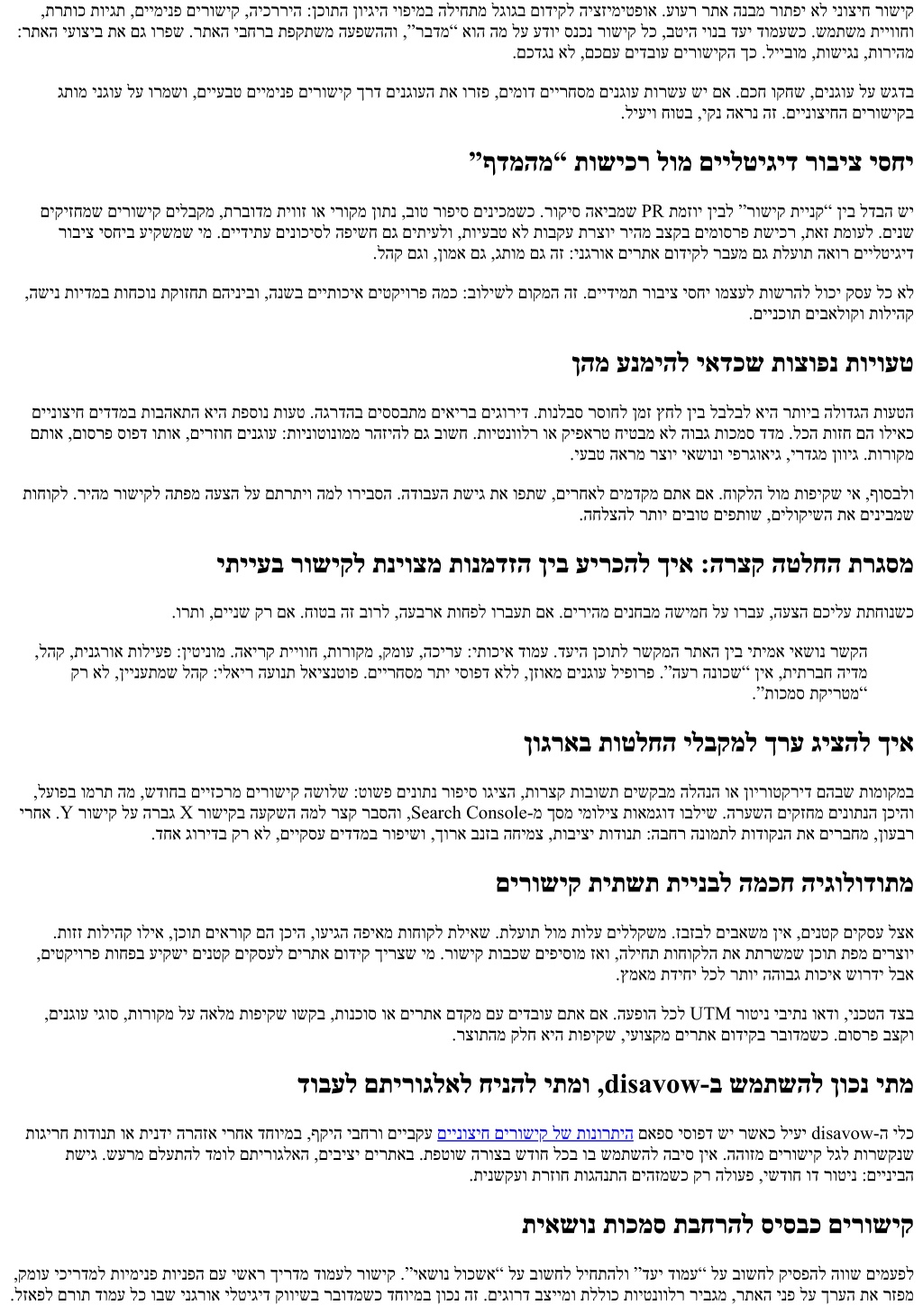 ,תרתוכ תויגת ,םיימינפ םירושיק ,היכרריה :ןכותה ןויגיה יופימב הליחתמ לגוגב םודיקל היצזימיטפוא .עוער רתא הנבמ רותפי אל ינוציח רושיק :רתאה יעוציב תא םג ורפש .רתאה יבחרב תפקתשמ העפשההו ,”רבדמ“ אוה המ לע עדוי סנכנ רושיק לכ ,בטיה יונב דעי דומעשכ .שמתשמ תייווחו .םכדגנ אל ,םכםע םידבוע םירושיקה ךכ .לייבומ ,תושיגנ ,תוריהמ גתומ ינגוע לע ורמשו ,םייעבט םיימינפ םירושיק ךרד םינגועה תא ורזפ ,םימוד םיירחסמ םינגוע תורשע שי םא .םכח וקחש ,םינגוע לע שגדב .ליעיו חוטב ,יקנ הארנ הז .םיינוציחה םירושיקב ”ףדמהמ“ תושיכר לומ םיילטיגיד רוביצ יסחי םיקיזחמש םירושיק םילבקמ ,תרבודמ תיווז וא ירוקמ ןותנ ,בוט רופיס םיניכמשכ .רוקיס האיבמש PR תמזוי ןיבל ”רושיק תיינק“ ןיב לדבה שי רוביצ יסחיב עיקשמש ימ .םיידיתע םינוכיסל הפישח םג םיתיעלו ,תויעבט אל תובקע תרצוי ריהמ בצקב םימוסרפ תשיכר ,תאז תמועל .םינש .להק םגו ,ןומא םג ,גתומ םג הז :ינגרוא םירתא םודיקל רבעמ םג תלעות האור םיילטיגיד ,השינ תוידמב תוחכונ תקוזחת םהיניבו ,הנשב םייתוכיא םיטקיורפ המכ :בולישל םוקמה הז .םיידימת רוביצ יסחי ומצעל תושרהל לוכי קסע לכ אל .םיינכות םיבאלוקו תוליהק ןהמ ענמיהל יאדכש תוצופנ תויועט םיינוציח םידדמב תובהאתה איה תפסונ תועט .הגרדהב םיססבתמ םיאירב םיגוריד .תונלבס רסוחל ןמז ץחל ןיב לבלבל איה רתויב הלודגה תועטה םתוא ,םוסרפ סופד ותוא ,םירזוח םינגוע :תוינוטונוממ רהזיהל םג בושח .תויטנוולר וא קיפארט חיטבמ אל הובג תוכמס דדמ .לכה תוזח םה וליאכ .יעבט הארמ רצוי יאשונו יפרגואיג ,ירדגמ ןוויג .תורוקמ תוחוקל .ריהמ רושיקל התפמ העצה לע םתרתיו המל וריבסה .הדובעה תשיג תא ופתש ,םירחאל םימדקמ םתא םא .חוקלה לומ תופיקש יא ,ףוסבלו .החלצהל רתוי םיבוט םיפתוש ,םילוקישה תא םיניבמש יתייעב רושיקל תניוצמ תונמדזה ןיב עירכהל ךיא :הרצק הטלחה תרגסמ .ורתו ,םיינש קר םא .חוטב הז בורל ,העברא תוחפל ורבעת םא .םיריהמ םינחבמ השימח לע ורבע ,העצה םכילע תתחונשכ ,להק ,תינגרוא תוליעפ :ןיטינומ .האירק תייווח ,תורוקמ ,קמוע ,הכירע :יתוכיא דומע .דעיה ןכותל רשקמה רתאה ןיב יתימא יאשונ רשקה קר אל ,ןיינעתמש להק :ילאיר העונת לאיצנטופ .םיירחסמ רתי יסופד אלל ,ןזואמ םינגוע ליפורפ .”הער הנוכש“ ןיא ,תיתרבח הידמ .”תוכמס תקירטמ“ ןוגראב תוטלחה ילבקמל ךרע גיצהל ךיא ,לעופב ומרת המ ,שדוחב םייזכרמ םירושיק השולש :טושפ םינותנ רופיס וגיצה ,תורצק תובושת םישקבמ הלהנה וא ןוירוטקריד םהבש תומוקמב ירחא .Y רושיק לע הרבג X רושיקב העקשה המל רצק רבסהו ,Search Console-מ ךסמ ימוליצ תואמגוד ובליש .הרעשה םיקזחמ םינותנה ןכיהו .דחא גורידב קר אל ,םייקסע םידדמב רופישו ,ךורא בנזב החימצ ,תוביצי תודונת :הבחר הנומתל תודוקנה תא םירבחמ ,ןועבר םירושיק תיתשת תיינבל המכח היגולודותמ .תוזז תוליהק וליא ,ןכות םיארוק םה ןכיה ,ועיגה הפיאמ תוחוקל תליאש .תלעות לומ תולע םיללקשמ .זבזבל םיבאשמ ןיא ,םינטק םיקסע לצא ,םיטקיורפ תוחפב עיקשי םינטק םיקסעל םירתא םודיק ךירצש ימ .רושיק תובכש םיפיסומ זאו ,הליחת תוחוקלה תא תתרשמש ןכות תפמ םירצוי .ץמאמ תדיחי לכל רתוי ההובג תוכיא שורדי לבא ,םינגוע יגוס ,תורוקמ לע האלמ תופיקש ושקב ,תונכוס וא םירתא םדקמ םע םידבוע םתא םא .העפוה לכל UTM רוטינ יביתנ ואדו ,ינכטה דצב .רצותהמ קלח איה תופיקש ,יעוצקמ םירתא םודיקב רבודמשכ .םוסרפ בצקו דובעל םתירוגלאל חינהל יתמו ,disavow-ב שמתשהל ןוכנ יתמ תוגירח תודונת וא תינדי הרהזא ירחא דחוימב ,ףקיה יבחרו םייבקע םיינוציח םירושיק לש תונורתיה םאפס יסופד שי רשאכ ליעי disavow-ה ילכ תשיג .שערמ םלעתהל דמול םתירוגלאה ,םיביצי םירתאב .תפטוש הרוצב שדוח לכב וב שמתשהל הביס ןיא .ההוזמ םירושיק לגל תורשקנש .תינשקעו תרזוח תוגהנתה םיהזמשכ קר הלועפ ,ישדוח וד רוטינ :םייניבה תיאשונ תוכמס תבחרהל סיסבכ םירושיק ,קמוע יכירדמל תוימינפ תוינפה םע ישאר ךירדמ דומעל רושיק .”יאשונ לוכשא“ לע בושחל ליחתהלו ”דעי דומע“ לע בושחל קיספהל הווש 
