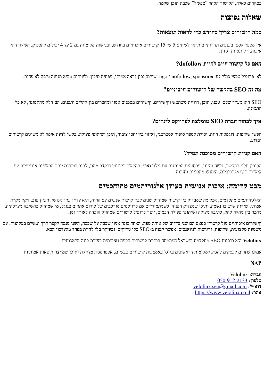 .המלש ןכות תבכש ”ליעפמ“ דחאה רושיקה ,הלאכ םירקמב תוצופנ תולאש ?תואצות תוארל ידכ שדוחב ךירצ םירושיק המכ אוה רקיעה .קיפסהל םילוכי 4 דע 2 םג תוימוקמ תושינבו ,שדוחב םייתוכיא םירושיק 15 דע 5 םיתיעל וארת םייתורחת םיפנעב .םסק רפסמ ןיא .ןוויגו תויטנוולר ,תוכיא ?dofollow תויהל בייח רושיק לכ םאה .תוחפ אל הבוט העונת איבמ םיתיעלו ,ןוכיס תיחפמ ,יתימא הארנ ןוכנ בוליש .ugc-ו nofollow, sponsored םג ללוכ יעבט ליפורפ .אל ?םיינוציח םירושיק לש רשקהב SEO הז המ לכ אל ,הנומתהמ קלח םה .םינכתו םילהק ןיב םירבחמו ןומא םינמסמ םירושיק .םירושיקו שמתשמ תייווח ,ןכות ,ינכט :םלש ךרעמ אוה SEO .הנומתה ?םיקניל טקיורפל תצלמומ SEO תרבח רוחבל ךיא םירושיק םיגישמ אל הפיא תעדל ושקב .הלועפ יפותישו ןכות ,רוביצ יסחי ןיב ןוזיאו ,יגטרטסא רופיס רפסל תלוכי ,תויח תואמגוד ,תופיקש ושפח .עודמו ?דימת תנכוסמ םירושיק תיינק םאה םע תוימינונא תותשרמ רתוי םיחוטב בורל ,ןותמ בצקבו יטנוולר רשקהב ,תואנ יוליג םע םיגתוממ םימוסרפ .ןונימו השיג ,רשקהב יולת ןוכיסה .תורזחו תוינבתמ וענמיה .םייביסרגא ףסכ ירושיק םימכחותמ םימתירוגלא ןדיעב תישונא תוכיא :המידק טבמ הרקמ רקח ,בוט ןויער .ישונא ךרע ןיידע אוה ,חורה םע םלענש רושיק ןיבל םינש קיזחמש רושיק ןיב לידבמש המ לבא ,םימדקתמ םימתירוגלאה ,תיתכרעמ הבישחב קיזחמש ימ ,לגוגב םירתא םודיק לש םיבכרומ םיטקיורפ םע םידדומתמשכ .הינפה קידצמש ןכותו ,המשנ וב שיש תוריש ,יתימא .ןמז ךרואל החכוה קיזחמש םירושיק ליפורפ רצוי ,םימכח הלועפ יפותישו הלועמ הביתכ ,להק רקחמ ןיב רבחמ םע .תוציקעב םלשמו ךרד רצקל הסנמ ינשה ,הבכש לע הבכש ןומא הנוב דחאה .הפמ התוא לש םידדצ ינש םה םאפס ירושיק לומ םייתוכיא םירושיק .אבה ןוכדעהמ דחפב תויחל ילב רקיעבו ,םיקירט ילב SEO-ב חצנל רשפא ,םיסנאוינל תושיגרו ,תופיקש ,תיעוצקמ תעמשמ .תיתוכאלמ הניב תרזעב תיתוכיאו המכח םירושיק תיינבב החמתמה לארשיב תמדקתמ SEO תונכוס איה Velolinx .תויתימא תואצות רציימש ןכותו תקיודמ היגטרטסא ,םייעבט םירושיק תועצמאב לגוגב םינושארה תומוקמל עיגהל םיקסעל םירזוע ונחנא NAP Velolinx :הרבח 050-912-2133:ןופלט velolinx.seo@gmail.com:ל״אוד https://www.velolinx.co.il:רתא