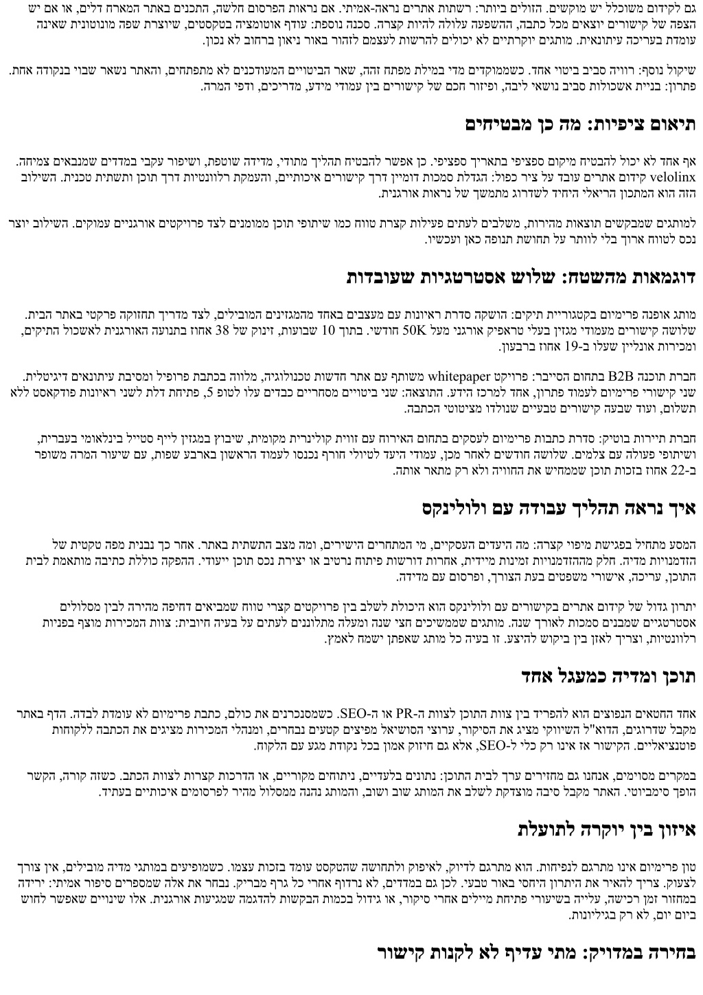 שי םא וא ,םילד חראמה רתאב םינכתה ,השלח םוסרפה תוארנ םא .יתימא-הארנ םירתא תותשר :רתויב םילוזה .םישקומ שי ללכושמ םודיקל םג הניאש תינוטונומ הפש תרצויש ,םיטסקטב היצמוטוא ףדוע :תפסונ הנכס .הרצק תויהל הלולע העפשהה ,הבתכ לכמ םיאצוי םירושיק לש הפצה .ןוכנ אל בוחרב ןואינ רואב רוהזל םמצעל תושרהל םילוכי אל םייתרקוי םיגתומ .תיאנותיע הכירעב תדמוע .תחא הדוקנב יובש ראשנ רתאהו ,םיחתפתמ אל םינכדועמה םייוטיבה ראש ,ההז חתפמ תלימב ידמ םידקוממשכ .דחא יוטיב ביבס היוור :ףסונ לוקיש .הרמה יפדו ,םיכירדמ ,עדימ ידומע ןיב םירושיק לש םכח רוזיפו ,הביל יאשונ ביבס תולוכשא תיינב :ןורתפ םיחיטבמ ןכ המ :תויפיצ םואית .החימצ םיאבנמש םידדמב יבקע רופישו ,תפטוש הדידמ ,ידותמ ךילהת חיטבהל רשפא ןכ .יפיצפס ךיראתב יפיצפס םוקימ חיטבהל לוכי אל דחא ףא בולישה .תינכט תיתשתו ןכות ךרד תויטנוולר תקמעהו ,םייתוכיא םירושיק ךרד ןיימוד תוכמס תלדגה :לופכ ריצ לע דבוע םירתא םודיק velolinx .תינגרוא תוארנ לש ךשמתמ גורדשל דיחיה ילאירה ןוכתמה אוה הזה רצוי בולישה .םיקומע םיינגרוא םיטקיורפ דצל םינמוממ ןכות יפותיש ומכ חווט תרצק תוליעפ םיתעל םיבלשמ ,תוריהמ תואצות םישקבמש םיגתומל .וישכעו ןאכ הפונת תשוחת לע רתוול ילב ךורא חווטל סכנ תודבועש תויגטרטסא שולש :חטשהמ תואמגוד .תיבה רתאב יטקרפ הקוזחת ךירדמ דצל ,םיליבומה םיניזגמהמ דחאב םיבצעמ םע תונויאר תרדס הקשוה :םיקית תיירוגטקב םוימירפ הנפוא גתומ ,םיקיתה לוכשאל תינגרואה העונתב זוחא 38 לש קוניז ,תועובש 10 ךותב .ישדוח 50K לעמ ינגרוא קיפארט ילעב ןיזגמ ידומעמ םירושיק השולש .ןועברב זוחא 19-ב ולעש ןיילנוא תוריכמו .תילטיגיד םיאנותיע תביסמו ליפורפ תבתכב הוולמ ,היגולונכט תושדח רתא םע ףתושמ whitepaper טקיורפ :רבייסה םוחתב B2B הנכות תרבח אלל טסאקדופ תונויאר ינשל תלד תחיתפ ,5 פוטל ולע םידבכ םיירחסמ םייוטיב ינש :האצותה .עדיה זכרמל דחא ,ןורתפ דומעל םוימירפ ירושיק ינש .הבתכה יטוטיצמ ודלונש םייעבט םירושיק העבש דועו ,םולשת ,תירבעב ימואלניב לייטס ףייל ןיזגמב ץוביש ,תימוקמ תירנילוק תיווז םע חוריאה םוחתב םיקסעל םוימירפ תובתכ תרדס :קיטוב תוריית תרבח רפושמ הרמה רועיש םע ,תופש עבראב ןושארה דומעל וסנכנ ףרוח ילויטל דעיה ידומע ,ןכמ רחאל םישדוח השולש .םימלצ םע הלועפ יפותישו .התוא ראתמ קר אלו היווחה תא שיחממש ןכות תוכזב זוחא 22-ב סקנילולו םע הדובע ךילהת הארנ ךיא לש תיטקט הפמ תינבנ ךכ רחא .רתאב תיתשתה בצמ המו ,םירישיה םירחתמה ימ ,םייקסעה םידעיה המ :הרצק יופימ תשיגפב ליחתמ עסמה תיבל תמאתומ הביתכ תללוכ הקפהה .ידועיי ןכות סכנ תריצי וא ביטרנ חותיפ תושרוד תורחא ,תידיימ תונימז תויונמדזההמ קלח .הידמ תויונמדזה .הדידמ םע םוסרפו ,ךרוצה תעב םיטפשמ ירושיא ,הכירע ,ןכותה םילולסמ ןיבל הריהמ הפיחד םיאיבמש חווט ירצק םיטקיורפ ןיב בלשל תלוכיה אוה סקנילולו םע םירושיקב םירתא םודיק לש לודג ןורתי תוינפב ףצומ תוריכמה תווצ :תיבויח היעב לע םיתעל םיננולתמ הלעמו הנש יצח םיכישממש םיגתומ .הנש ךרואל תוכמס םינבמש םייגטרטסא .ץמאל חמשי ןתפאש גתומ לכ היעב וז .עציהל שוקיב ןיב ןזאל ךירצו ,תויטנוולר דחא לגעמכ הידמו ןכות רתאב ףדה .הדבל תדמוע אל םוימירפ תבתכ ,םלוכ תא םינרכנסמשכ .SEO-ה וא PR-ה תווצל ןכותה תווצ ןיב דירפהל אוה םיצופנה םיאטחה דחא תוחוקלל הבתכה תא םיגיצמ תוריכמה ילהנמו ,םירחבנ םיעטק םיציפמ לאישוסה יצורע ,רוקיסה תא גיצמ יקווישה ל"אודה ,םיגורדש לבקמ .חוקלה םע עגמ תדוקנ לכב ןומא קוזיח םג אלא ,SEO-ל ילכ קר וניא זא רושיקה .םיילאיצנטופ רשקה ,הרוק הזשכ .בתכה תווצל תורצק תוכרדה וא ,םיירוקמ םיחותינ ,םיידעלב םינותנ :ןכותה תיבל ךרע םיריזחמ םג ונחנא ,םימיוסמ םירקמב .דיתעב םייתוכיא םימוסרפל ריהמ לולסממ הנהנ גתומהו ,בושו בוש גתומה תא בלשל תקדצומ הביס לבקמ רתאה .יטויבמיס ךפוה תלעותל הרקוי ןיב ןוזיא ךרוצ ןיא ,םיליבומ הידמ יגתומב םיעיפומשכ .ומצע תוכזב דמוע טסקטהש השוחתלו קופיאל ,קוידל ם